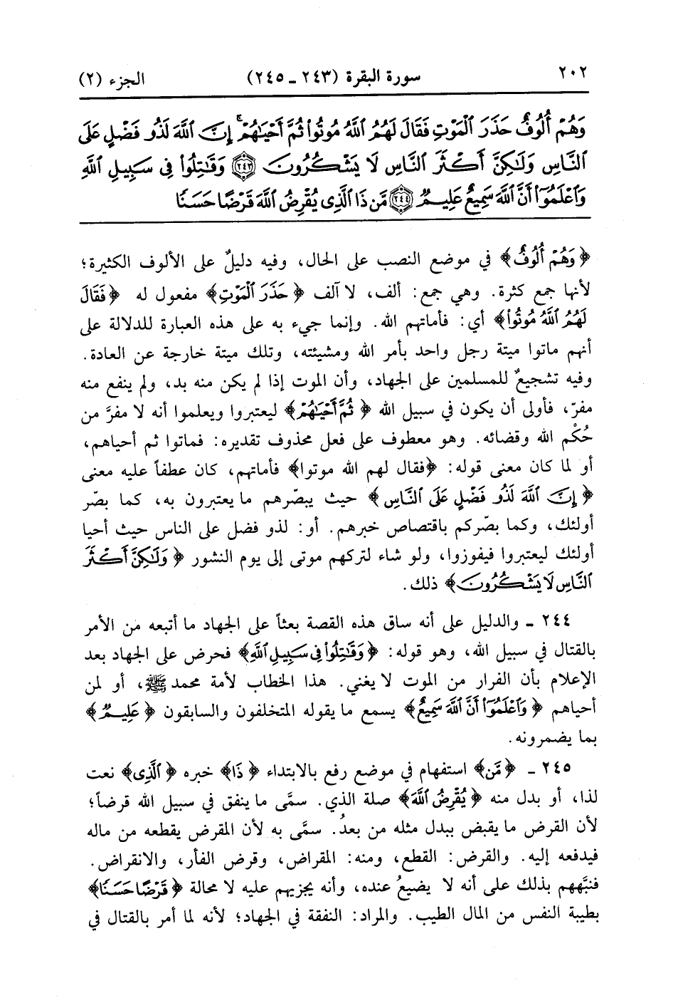 {وَهُمْ أُلُوفٌ} في موضع النصب على الحال وفيه دليل على الألوف الكثيرة لأنها جمع كثرة وهي جمع ألف لا آلف {حَذَرَ الموت} مفعول له {فَقَالَ لَهُمُ الله مُوتُواْ} أي فأماتهم الله وإنما جئ به على هذه العبارة للدلالة على أنهم ماتوا ميتة رجل واحد بأمر الله ومشيئته وتلك ميتة خارجة عن العادة وفيه تشجيع للمسلمين على الجهاد وأن الموت إذا لم يكن منه بد ولم ينفع منه مفر فأولى أن يكون في سبيل الله {ثُمَّ أحياهم} ليعتبروا ويعلموا أنه لا مفر من حكم الله وقضائه وهو معطوف على فعل محذوف تقديره فماتوا ثم احياهم أو لما كان معنى قوله فقال لهم الله موتوا فأماتهم كان عطفاً عليه معنى {إِنَّ الله لَذُو فَضْلٍ عَلَى الناس} حيث يبصرهم ما يعتبرون به كما بصر أولئك وكما بصركم باقتصاص خبرهم أو لذو فضل على الناس حيث أحيا أولئك ليعتبروا فيفوزوا ولو شاء لتركهم موتى إلى يوم النشور {ولكن أَكْثَرَ الناس لاَ يَشْكُرُونَ} ذلك والدليل على أنه ساق هذه القصة بعثاً على الجهاد ما أتبعه من الأمر بالقتال في سبيل الله وهو قوله