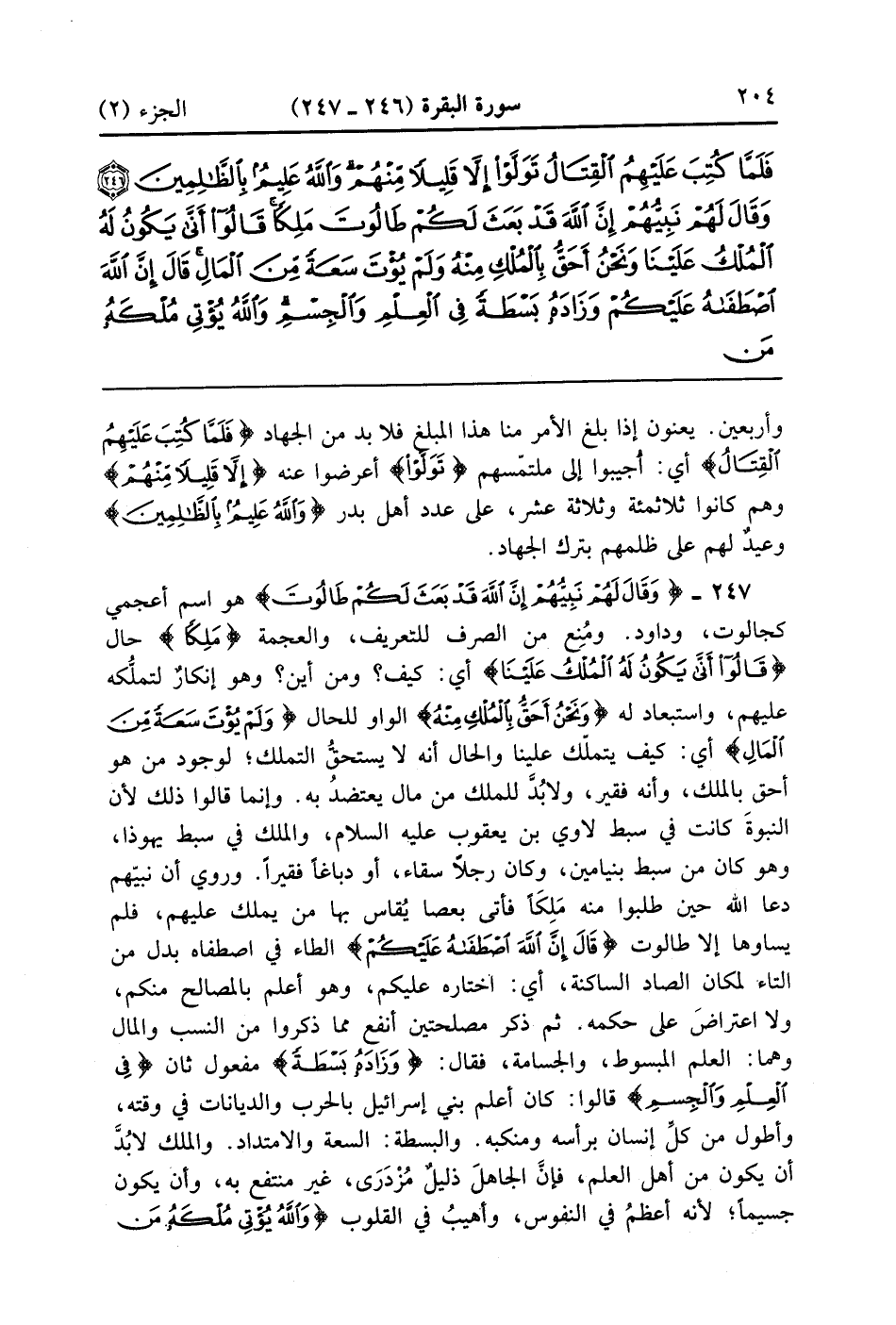 وَقَالَ لَهُمْ نَبِيُّهُمْ إِنَّ اللَّهَ قَدْ بَعَثَ لَكُمْ طَالُوتَ مَلِكًا قَالُوا أَنَّى يَكُونُ لَهُ الْمُلْكُ عَلَيْنَا وَنَحْنُ أَحَقُّ بِالْمُلْكِ مِنْهُ وَلَمْ يُؤْتَ سَعَةً مِنَ الْمَالِ قَالَ إِنَّ اللَّهَ اصْطَفَاهُ عَلَيْكُمْ وَزَادَهُ بَسْطَةً فِي الْعِلْمِ وَالْجِسْمِ وَاللَّهُ يُؤْتِي مُلْكَهُ مَنْ يَشَاءُ وَاللَّهُ وَاسِعٌ عَلِيمٌ (247)