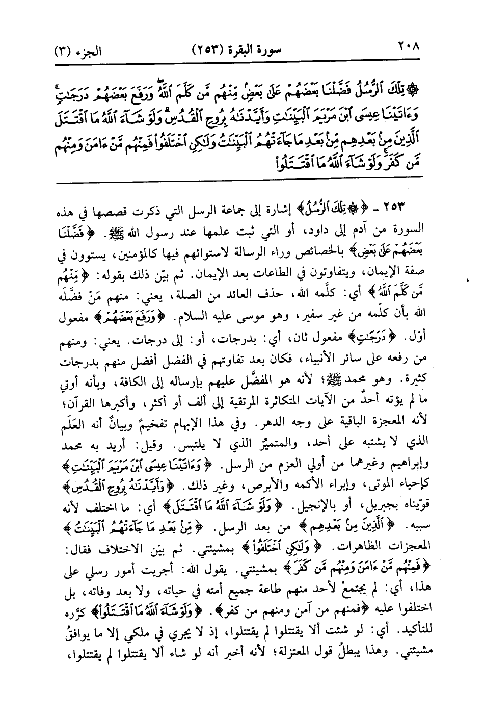 تِلْكَ الرُّسُلُ فَضَّلْنَا بَعْضَهُمْ عَلَى بَعْضٍ مِنْهُمْ مَنْ كَلَّمَ اللَّهُ وَرَفَعَ بَعْضَهُمْ دَرَجَاتٍ وَآتَيْنَا عِيسَى ابْنَ مَرْيَمَ الْبَيِّنَاتِ وَأَيَّدْنَاهُ بِرُوحِ الْقُدُسِ وَلَوْ شَاءَ اللَّهُ مَا اقْتَتَلَ الَّذِينَ مِنْ بَعْدِهِمْ مِنْ بَعْدِ مَا جَاءَتْهُمُ الْبَيِّنَاتُ وَلَكِنِ اخْتَلَفُوا فَمِنْهُمْ مَنْ آمَنَ وَمِنْهُمْ مَنْ كَفَرَ وَلَوْ شَاءَ اللَّهُ مَا اقْتَتَلُوا وَلَكِنَّ اللَّهَ يَفْعَلُ مَا يُرِيدُ (253)