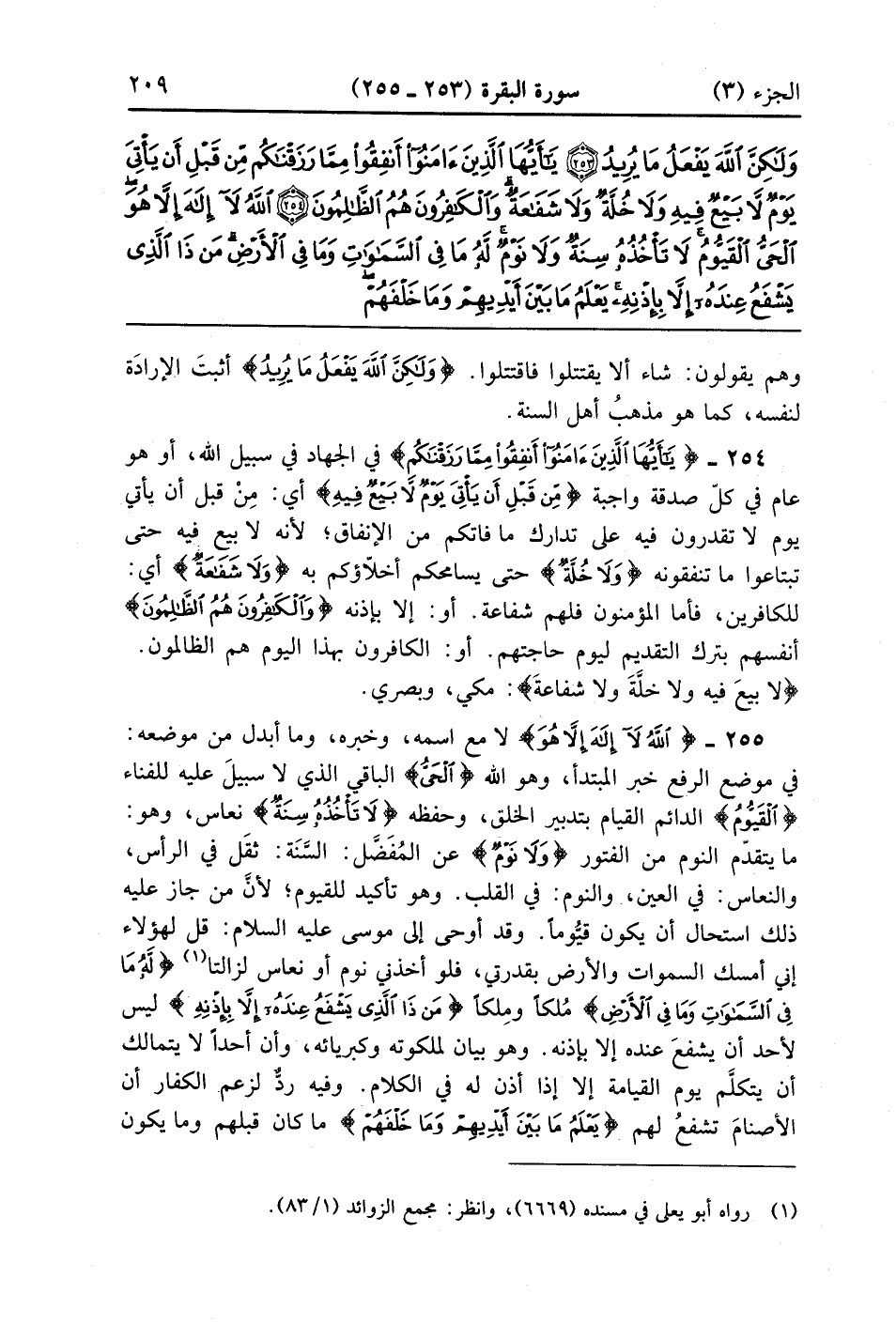 اللَّهُ لَا إِلَهَ إِلَّا هُوَ الْحَيُّ الْقَيُّومُ لَا تَأْخُذُهُ سِنَةٌ وَلَا نَوْمٌ لَهُ مَا فِي السَّمَاوَاتِ وَمَا فِي الْأَرْضِ مَنْ ذَا الَّذِي يَشْفَعُ عِنْدَهُ إِلَّا بِإِذْنِهِ يَعْلَمُ مَا بَيْنَ أَيْدِيهِمْ وَمَا خَلْفَهُمْ وَلَا يُحِيطُونَ بِشَيْءٍ مِنْ عِلْمِهِ إِلَّا بِمَا شَاءَ وَسِعَ كُرْسِيُّهُ السَّمَاوَاتِ وَالْأَرْضَ وَلَا يَئُودُهُ حِفْظُهُمَا وَهُوَ الْعَلِيُّ الْعَظِيمُ (255)