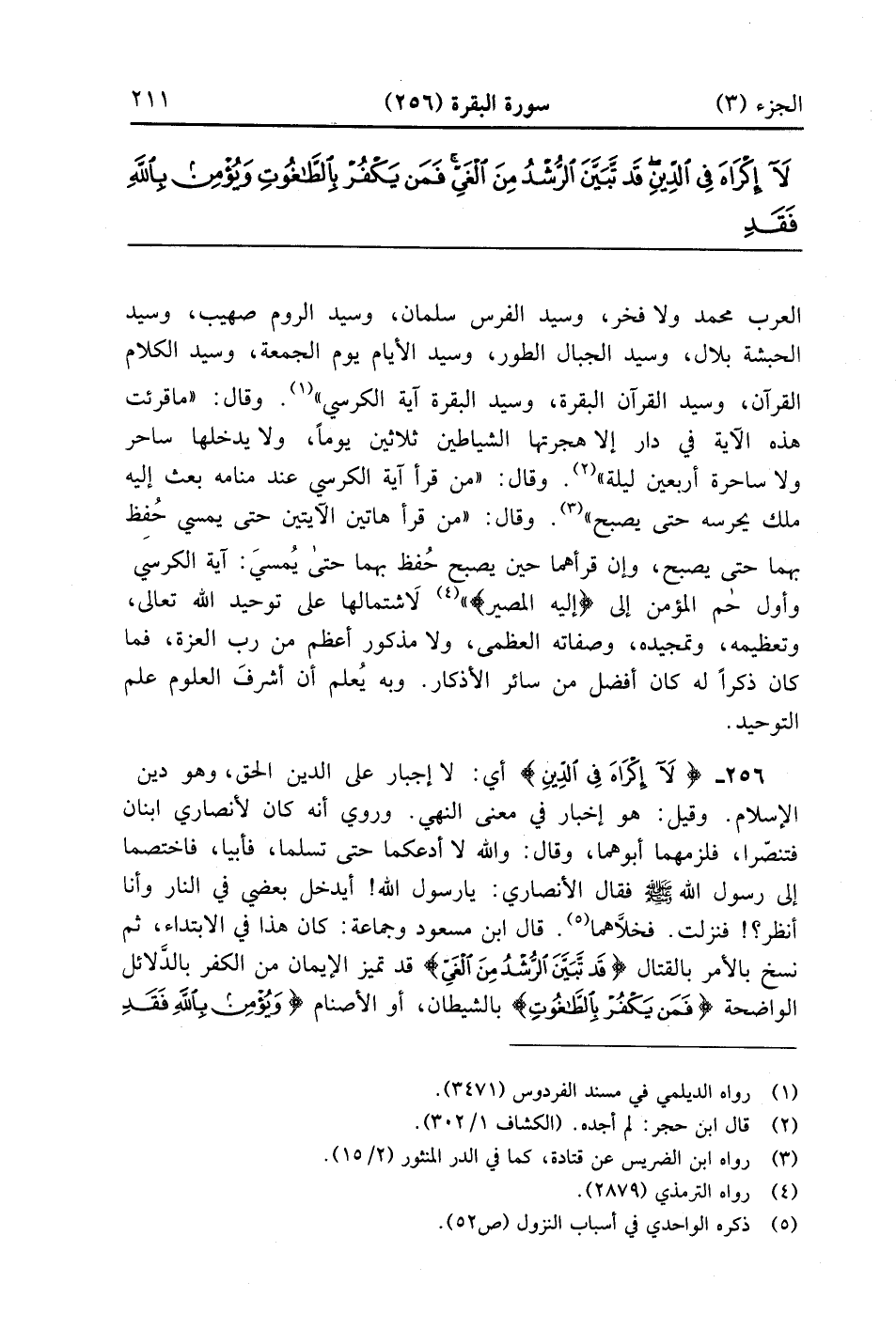 لَا إِكْرَاهَ فِي الدِّينِ قَدْ تَبَيَّنَ الرُّشْدُ مِنَ الْغَيِّ فَمَنْ يَكْفُرْ بِالطَّاغُوتِ وَيُؤْمِنْ بِاللَّهِ فَقَدِ اسْتَمْسَكَ بِالْعُرْوَةِ الْوُثْقَى لَا انْفِصَامَ لَهَا وَاللَّهُ سَمِيعٌ عَلِيمٌ (256)