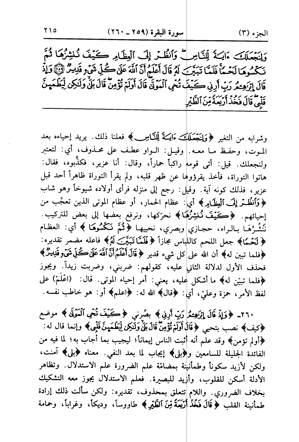 وَإِذْ قَالَ إِبْرَاهِيمُ رَبِّ أَرِنِي كَيْفَ تُحْيِ الْمَوْتَى قَالَ أَوَلَمْ تُؤْمِنْ قَالَ بَلَى وَلَكِنْ لِيَطْمَئِنَّ قَلْبِي قَالَ فَخُذْ أَرْبَعَةً مِنَ الطَّيْرِ فَصُرْهُنَّ إِلَيْكَ ثُمَّ اجْعَلْ عَلَى كُلِّ جَبَلٍ مِنْهُنَّ جُزْءًا ثُمَّ ادْعُهُنَّ يَأْتِينَكَ سَعْيًا وَاعْلَمْ أَنَّ اللَّهَ عَزِيزٌ حَكِيمٌ (260)