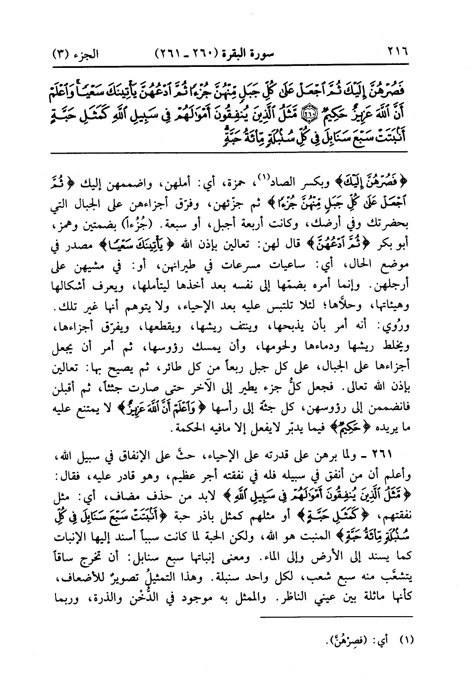 {فَصُرْهُنَّ إِلَيْكَ} وبكسر الصاد حمزة أى امهلهن واضممهن إليك {ثُمَّ اجعل على كُلِ ّجَبَلٍ مّنْهُنَّ جُزْءا} ثم جزئهن وفرق أجزاءهن على الجبال التي بحضرتك وفي أرضك وكانت أربعة أجبل أو سبعة جزءا بضمتين وهمز أبو بكر {ثُمَّ ادعهن} قل لهن تعالين بإذن الله {يَأْتِينَكَ سَعْيًا} مصدر في موضع الحال أي ساعيات مسرعات في طيرانهن أو في مشيهن على أرجلهن وإنما أمره بضمها إلى نفسه بعد أخذها ليتأملها ويعرف أشكالها وهيآتها وحلاها لئلا تلتبس عليه االأحياء ولا يتوهم أنها غير تلك وروي أنه أمر بأن يذبحها وينتف ريشها ويقطعها ويفرق أجزاءها ويخلط ريشها ودماءها ولحومها وأن يمسك رءوسها ثم أمر أن يجعل أجزاءها على الجبال على كل جبل ربعاً من كل طائر ثم يصيح بها تعالين بإذن الله تعالى فجعل كل جزء يطير إلى الآخر حتى صارت جثثا ثم أقبلن فانضممن إلى رءوسهن كل جثة إلى رأسها {واعلم أَنَّ الله عَزِيزٌ} لا يمتنع عليه ما يريده {حَكِيمٌ} فيما يدبر لا يفعل إلا ما فيه الحكمة
