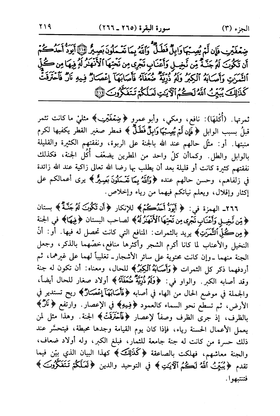 أَيَوَدُّ أَحَدُكُمْ أَنْ تَكُونَ لَهُ جَنَّةٌ مِنْ نَخِيلٍ وَأَعْنَابٍ تَجْرِي مِنْ تَحْتِهَا الْأَنْهَارُ لَهُ فِيهَا مِنْ كُلِّ الثَّمَرَاتِ وَأَصَابَهُ الْكِبَرُ وَلَهُ ذُرِّيَّةٌ ضُعَفَاءُ فَأَصَابَهَا إِعْصَارٌ فِيهِ نَارٌ فَاحْتَرَقَتْ كَذَلِكَ يُبَيِّنُ اللَّهُ لَكُمُ الْآيَاتِ لَعَلَّكُمْ تَتَفَكَّرُونَ (266)