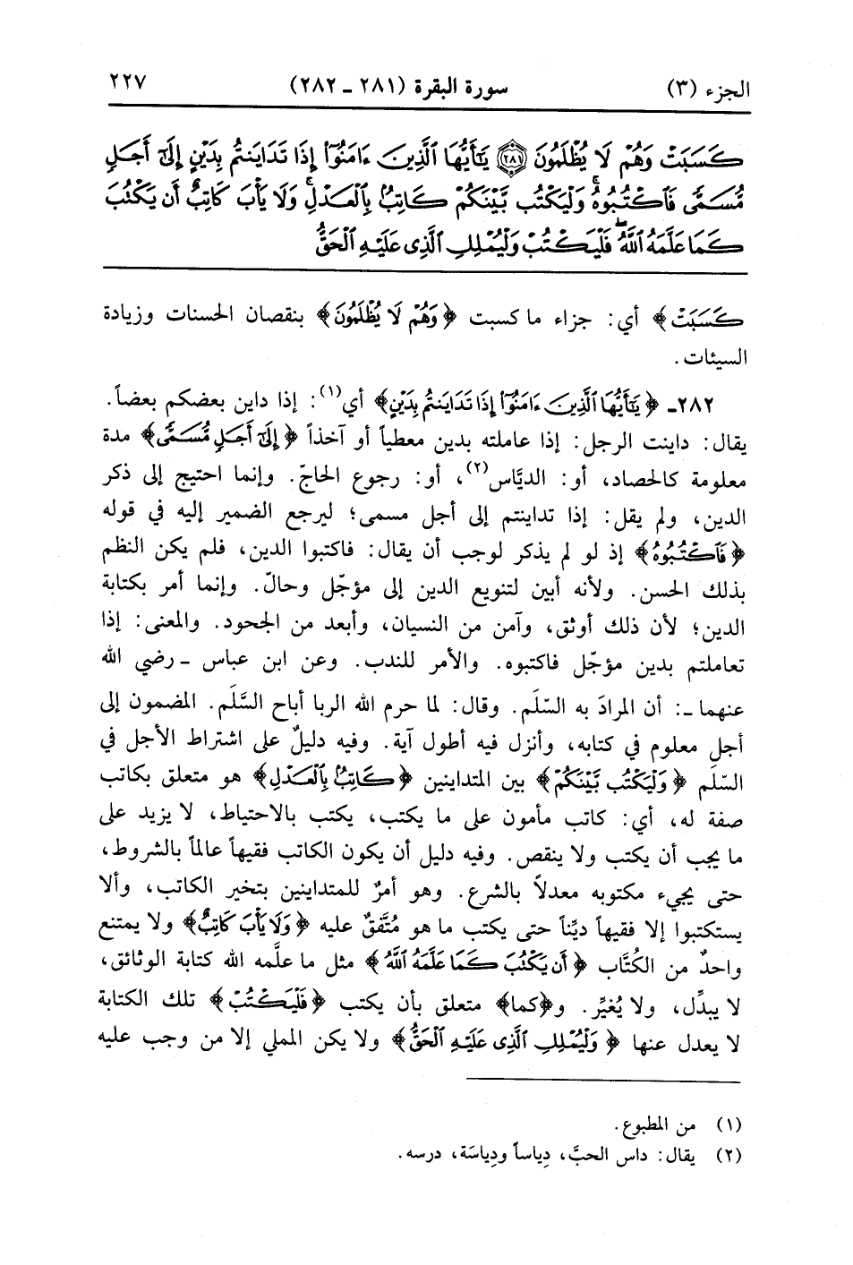 يَا أَيُّهَا الَّذِينَ آمَنُوا إِذَا تَدَايَنْتُمْ بِدَيْنٍ إِلَى أَجَلٍ مُسَمًّى فَاكْتُبُوهُ وَلْيَكْتُبْ بَيْنَكُمْ كَاتِبٌ بِالْعَدْلِ وَلَا يَأْبَ كَاتِبٌ أَنْ يَكْتُبَ كَمَا عَلَّمَهُ اللَّهُ فَلْيَكْتُبْ وَلْيُمْلِلِ الَّذِي عَلَيْهِ الْحَقُّ وَلْيَتَّقِ اللَّهَ رَبَّهُ وَلَا يَبْخَسْ مِنْهُ شَيْئًا فَإِنْ كَانَ الَّذِي عَلَيْهِ الْحَقُّ سَفِيهًا أَوْ ضَعِيفًا أَوْ لَا يَسْتَطِيعُ أَنْ يُمِلَّ هُوَ فَلْيُمْلِلْ وَلِيُّهُ بِالْعَدْلِ وَاسْتَشْهِدُوا شَهِيدَيْنِ مِنْ رِجَالِكُمْ فَإِنْ لَمْ يَكُونَا رَجُلَيْنِ فَرَجُلٌ وَامْرَأَتَانِ مِمَّنْ تَرْضَوْنَ مِنَ الشُّهَدَاءِ أَنْ تَضِلَّ إِحْدَاهُمَا فَتُذَكِّرَ إِحْدَاهُمَا الْأُخْرَى وَلَا يَأْبَ الشُّهَدَاءُ إِذَا مَا دُعُوا وَلَا تَسْأَمُوا أَنْ تَكْتُبُوهُ صَغِيرًا أَوْ كَبِيرًا إِلَى أَجَلِهِ ذَلِكُمْ أَقْسَطُ عِنْدَ اللَّهِ وَأَقْوَمُ لِلشَّهَادَةِ وَأَدْنَى أَلَّا تَرْتَابُوا إِلَّا أَنْ تَكُونَ تِجَارَةً حَاضِرَةً تُدِيرُونَهَا بَيْنَكُمْ فَلَيْسَ عَلَيْكُمْ جُنَاحٌ أَلَّا تَكْتُبُوهَا وَأَشْهِدُوا إِذَا تَبَايَعْتُمْ وَلَا يُضَارَّ كَاتِبٌ وَلَا شَهِيدٌ وَإِنْ تَفْعَلُوا فَإِنَّهُ فُسُوقٌ بِكُمْ وَاتَّقُوا اللَّهَ وَيُعَلِّمُكُمُ اللَّهُ وَاللَّهُ بِكُلِّ شَيْءٍ عَلِيمٌ (282)