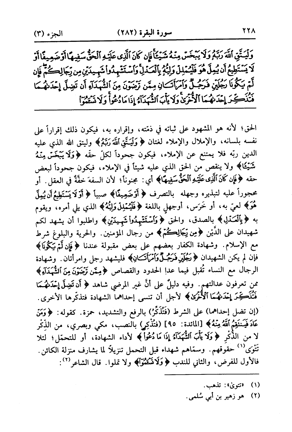 الحق لأنه هو المشهود على ثباته في ذمته وإقراره به فيكون ذلك إقراراً على نفسه بلسانه والإملال والإملاء لغتان {وَلْيَتَّقِ الله رَبَّهُ} وليتق الله الذي عليه الدين ربه فلا يمتنع عن الإملاء فيكون جحوداً لكل حقه {وَلاَ يَبْخَسْ مِنْهُ شَيْئاً} ولا ينقص من الحق الذي عليه شيئاً في الإملاء فيكون جحوداً لبعض حقه {فَإن كَانَ الذى عَلَيْهِ الحق سَفِيهًا} أي مجنوناً لأن السفه خفة في العقل أو محجوراً عليه لتبذيره وجهله بالتصرف {أَوْ ضَعِيفًا} صبياً {أَوْ لاَ يَسْتَطِيعُ أَن يُمِلَّ هُوَ} لعي به أو خرس أو جهل باللغة {فَلْيُمْلِلْ وَلِيُّهُ} الذي يلي أمره ويقوم به {بالعدل} بالصدق والحق {واستشهدوا شَهِيدَيْنِ} واطلبوا أن يشهد لكم شهيدان على الدين {مِّن رِّجَالِكُمْ} من رجال المؤمنين والحرية والبلوغ شرط مع الإسلام وشهادة الكفار بعضهم على بعض مقبولة عندنا {فَإِن لَّمْ يَكُونَا} فإن لم يكن الشهيدان {رَجُلَيْنِ فَرَجُلٌ وامرأتان} فليشهد رجل وامرأتان وشهادة الرجال مع النساء تقبل فيما عدا الحدود والقصاص {مِمَّن تَرْضَوْنَ مِنَ الشهداء} ممن تعرفون عدالتهم وفيه دليل على أن غير المرضي شاهد {أَن تَضِلَّ إْحْدَاهُمَا فَتُذَكّرَ إِحْدَاهُمَا الأخرى} لأجل أن تنسى إحداهما الشهادة فتذكرها الأخرى إن تضل إحداهما على الشرط فتذكر بالرفع والتشديد حمزة كقوله وَمَنْ عاد فينتقم الله منه
