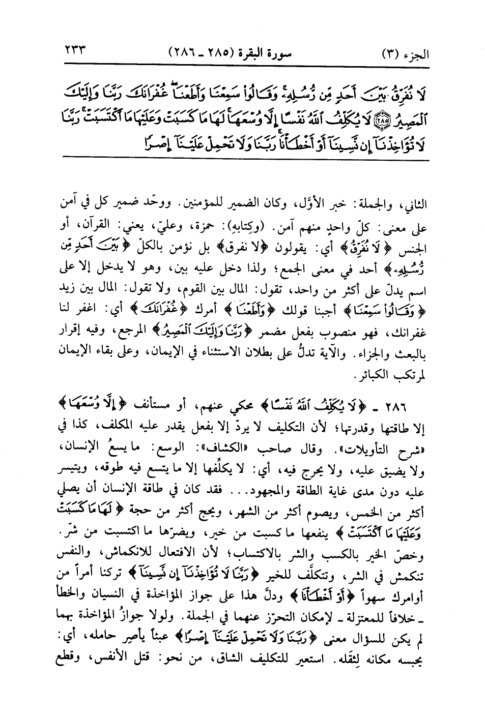 لَا يُكَلِّفُ اللَّهُ نَفْسًا إِلَّا وُسْعَهَا لَهَا مَا كَسَبَتْ وَعَلَيْهَا مَا اكْتَسَبَتْ رَبَّنَا لَا تُؤَاخِذْنَا إِنْ نَسِينَا أَوْ أَخْطَأْنَا رَبَّنَا وَلَا تَحْمِلْ عَلَيْنَا إِصْرًا كَمَا حَمَلْتَهُ عَلَى الَّذِينَ مِنْ قَبْلِنَا رَبَّنَا وَلَا تُحَمِّلْنَا مَا لَا طَاقَةَ لَنَا بِهِ وَاعْفُ عَنَّا وَاغْفِرْ لَنَا وَارْحَمْنَا أَنْتَ مَوْلَانَا فَانْصُرْنَا عَلَى الْقَوْمِ الْكَافِرِينَ (286)