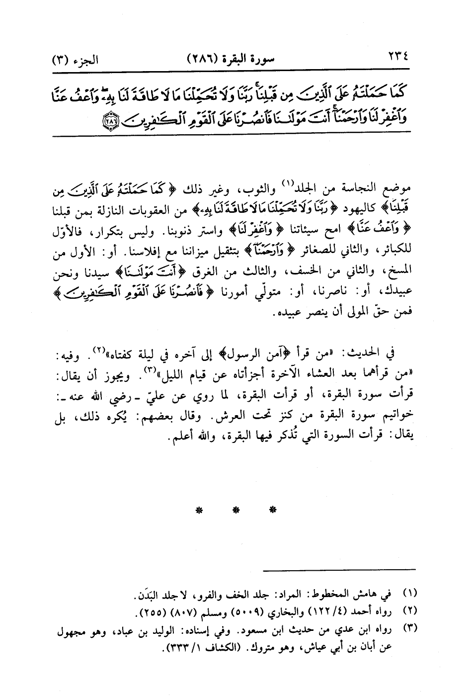 موضع النجاسة من الجلد والثوب وغير ذلك {كَمَا حَمَلْتَهُ عَلَى الذين مِن قَبْلِنَا} كاليهود {رَبَّنَا وَلاَ تُحَمِّلْنَا مَا لاَ طَاقَةَ لَنَا بِهِ} من العقوبات النازلة بمن قبلنا {واعف عنا} امح سيآتنا {واغفر لنا} واسترد ذنوبنا وليس بتكرار فالأول للكبائر والثاني للصغائر {وارحمنا} بتثقيل ميزاننا مع افلاسنا أو الأول من المسخ والثاني من الخسف والثالث من الغرق {أَنتَ مولانا} سيدنا ونحن عبيدك أو ناصرنا أو متولي أمورنا {فانصرنا عَلَى القوم الكافرين} فمن حق المولى أن ينصر عبيده في الحديث من قرأ آمن الرسول إلى آخره في ليلة كفتاه وفيه من قرأهما بعد العشاء الآخرة أجزأتاه عن قيام الليل ويجوز أن يقال قرأت سورة البقرة أو قرأت البقرة لما روى عن على رضى الله عنه خواتيم سورة البقرة من كنز تحت العرش وقال بعضهم يكره ذلك بل يقال قرأت السورة التي تذكر فيها البقرة والله أعلم