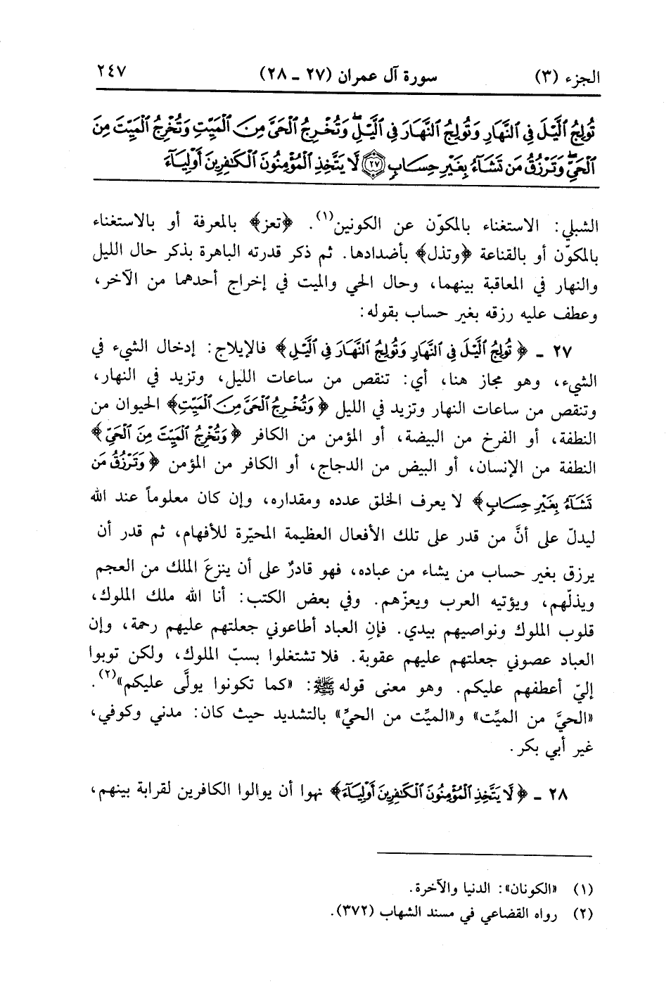 ثم ذكر قدرته بالباهرة بذكر حال الليل والنهار في المعاقبة بينهما وحال الحى والميت فى إخرج أحدهما من الآخر وعطف عليه رزقه بغير حساب بقوله {تولج الليل في النهار وتولج النهار في الليل} فالإيلاج ادخال الشئ فى الشئ وهو مجاز هنا أي تنقص من ساعات الليل وتزيد في النهار وتنقص من ساعات النهار وتزيد في الليل {وَتُخْرِجُ الحي مِنَ الميت} الحيوان من النطفة أو الفرج من البيضة أو المؤمن من الكافر {وَتُخْرِجُ الميت مِنَ الحي} النطفة من الإنسان أو البيض من الدجاج أو الكافر من المؤمن {وَتَرْزُقُ مَن تَشَاءُ بِغَيْرِ حِسَابٍ} لا يعرف الخلق عدده ومقداره وإن كان معلوماً عنده ليدل على أن من قدر على تلك الأفعال العظيمة المحيرة للأفهام ثم قدر أن يرزق بغير حساب