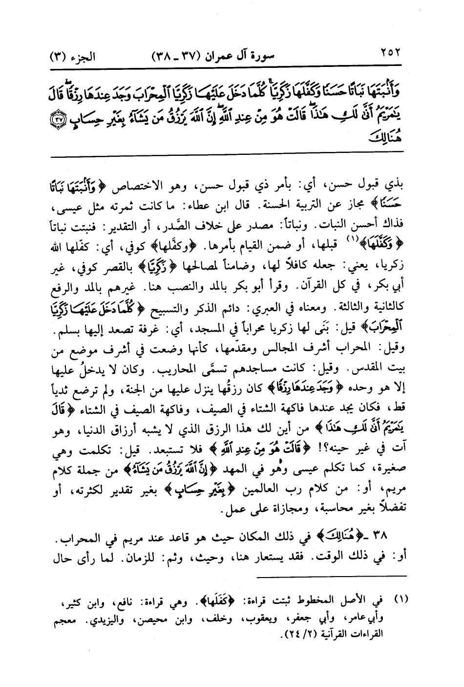 ثمرته مثل عيسى فذاك أحسن النبات ونباتاً مصدر على خلاف الصدر أو التقدير فنبتت نباتا {وكفلها} قبلها أو ضمن القيام بأمرها وكفّلها كوفي أي كفلها الله زكريا يعني جعله كافلاها وضامناً لمصالحها {زَكَرِيَّا} بالقصر كوفي غير أبي بكر في كل القرآن وقرأ أبو بكر بالمد والنصب هنا غيرهم بالمد والرفع كالثانية والثالثة ومعناه في العبري دائم الذكر والتسبيح {كُلَّمَا دَخَلَ عَلَيْهَا زَكَرِيَّا المحراب} قيل بنى لها زكريا محرابا فى السمجد أي غرفة تصعد إليها بسلم وقيل المحراب أشرف المجالس ومقدّمها كأنها وضعت في أشرف موضع من بيت المقدس وقيل كانت مساجدهم تسمى المحاريب وكان لا يدخل عليها إلا هو وحده {وَجَدَ عِندَهَا رِزْقًا} كان رزقها ينزل عليها من الجنة ولم ترضع ثدياً قط فكان يجد عندها فاكهة الشتاء في الصيف وفاكهة الصيف فى الشتاء {قال يا مريم أنى لَكِ هذا} من أين لك هذا الرزق الذي لا يشبه أرزاق الدنيا وهو آتٍ في غير حينه {قَالَتْ هُوَ مِنْ عِندِ الله} فلا تستبعد قيل تكلمت وهي صغيرة كما تكلم عيسى وهو في المهد {إنَّ الله يَرْزُقُ مَن يَشَاءُ} من جملة كلام مريم أو من كلام رب العالمين {بِغَيْرِ حِسَابٍ} بغير تقدير لكثرته أو تفضلاً بغير محاسبة ومجازاة على عمل