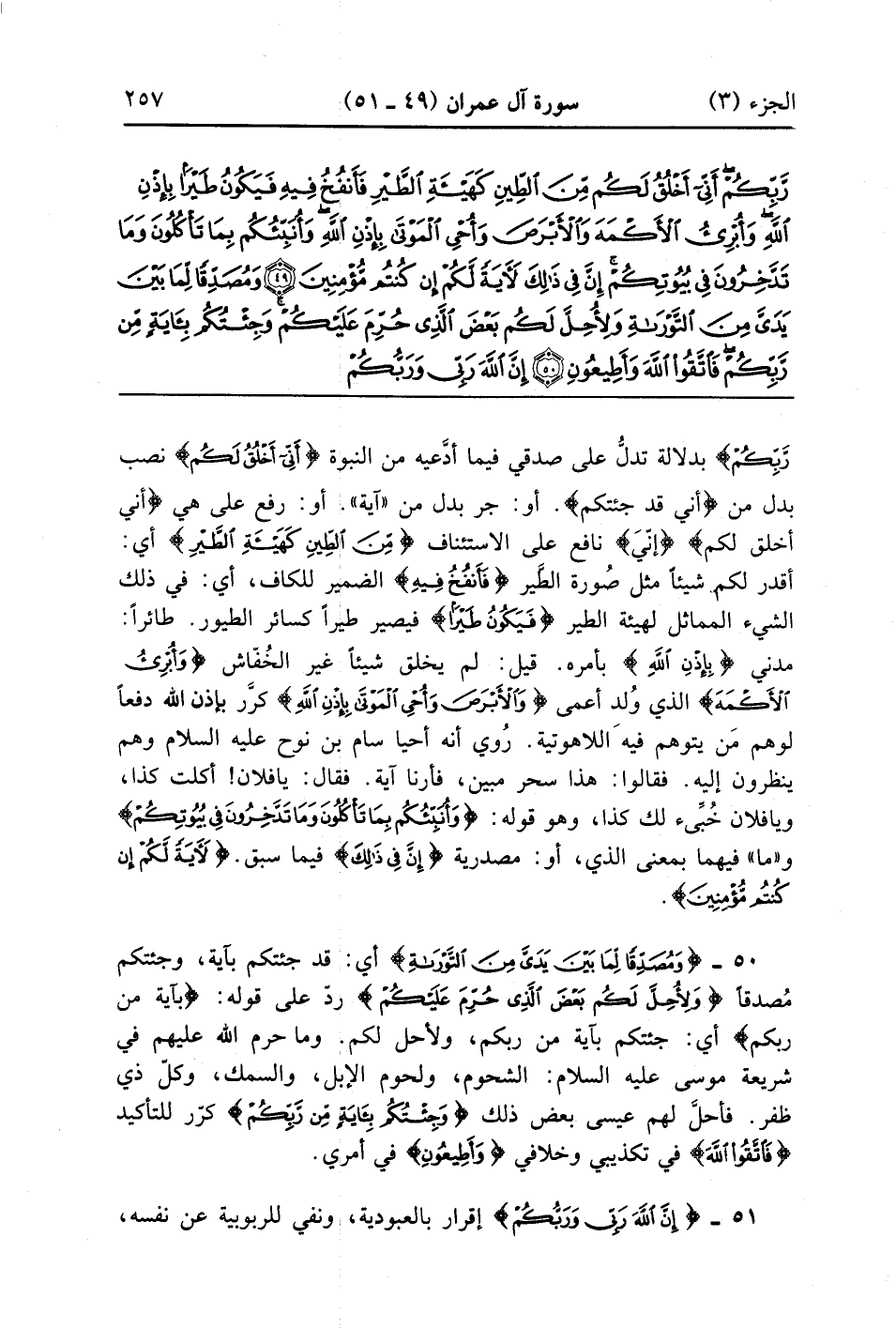 رَّبّكُمْ} بدلالة تدل على صدقي فيما أدعيه من النبوة {أَنِي أَخْلُقُ لَكُمْ} نصب بدل من أني قد جئتكم أو جر بدل من آية أو رفع على هي أني أخلق لم ِإنِّيَ نافع على الاستئناف {مِّنَ الطين كَهَيْئَةِ الطير} أي أقدر لكم شيئاً مثل صورة الطير {فَأَنفُخُ فِيهِ} الضمير للكاف أي في ذلك الشئ المماثل لهيئة الطير {فَيَكُونُ طَيْرًا} فيصير طيراً كسائر الطيور طائراً مدني {بِإِذُنِ الله} بأمره قيل لم يخلق شيئا غير الخفاش {وأبرئ الأكمه} الذى ولد أعمى {والأبرص وأحيي الموتى بِإِذْنِ الله} كرر بإذن الله دفعاً لوهم من يتوهم فيه اللاهوتية روي أنه أحيا سام ابن نوح عليه السلام وهم ينظرون إليه فقالوا هذا سحر مبين فأرنا آية فقال يا فلان اكلت كذا ويا فلان خبئ لك كذا وهو قوله {وَأُنَبّئُكُم بِمَا تَأْكُلُونَ وما تدخرون في بيوتكم} وما فيهما بمعنى الذي أو مصدرية {إِنَّ فِي ذلك} أى فيما سبق {لآيَةً لَّكُمْ إِن كُنتُم مُّؤْمِنِينَ}