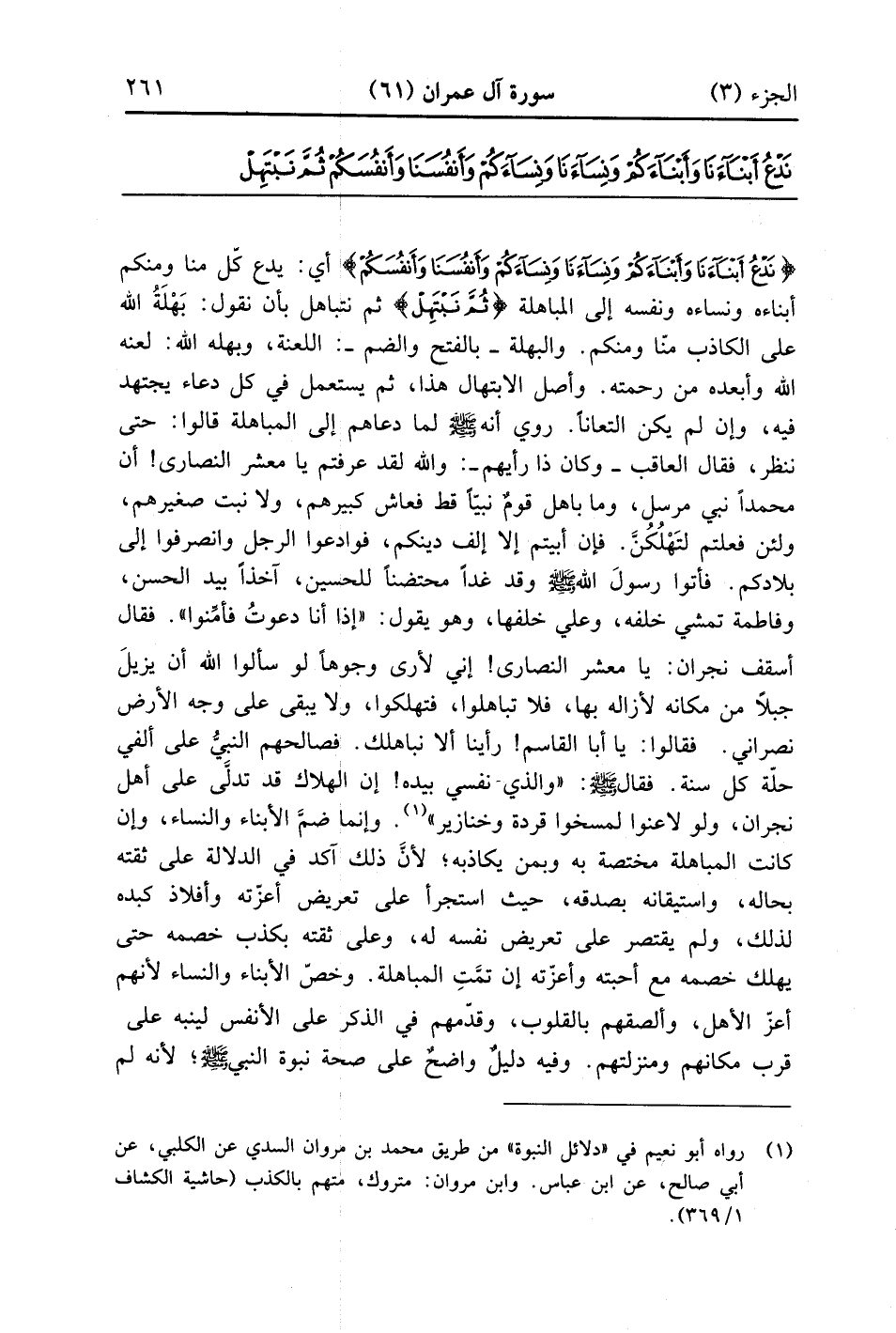 العاقب وكان ذا رأيهم والله لقد عرفتم يا معشر النصارى أمحمدا نبي مرسل وما باهل قوم نبياً قط فعاش كبيرهم ولا نبت صغيرهم ولئن فعلتم لنهلكن فإن أبيتم إلا إلف دينكم فوادعوا الرجل وانصرفوا إلى بلادكم فأتوا رسول الله صلى الله عليه وسلم وقد غدا محتضنا للحسين آخذا بيدالحسن وفاطمة تمشى خلقه وعليّ خلفها وهو يقول إذا أنا دعوت فأمنوا فقال أسقف نجران يا معشر النصارى إني لأرى وجوهاً لو سألوا الله أن يزيل جبلاً من مكانه لأزاله بها فلا تباهلوا فتهلكو ولا يبقى عل وجه الأرض نصراني فقالوا يا أبا القاسم رأينا أن لا نباهلك فصالحهم النبي على ألف حلة كل سنة فقال عليه السلام والذي نفسي بيده إن الهلاك قد تدلى على أهل نجران ولولا عنوا لمسخوا قردة وخنازير وإنما ضم الأبناء والنساء وإن كانت المباهلة مختصة وبمن يكاذبه لأن ذلك آكدا في الدلالة على ثقته بحاله واستيقانه بصدقه حيث استجرأ على تعريض أعزته وأفلاذ كبده لذلك ولم يقتصر على تعريض نفسه له وعلى ثقته بكذب خصمه حتى يهلك خصمه مع أحبته وأعزته إن تمت المباهلة وخص الأبناء والنساء لأنهم أعز الأهل وألصقهم بالقلوب وقدمهم في الذكر على الأنفس لينبه على قرب مكانهم ومنزلتهم وفيه دليل واضح على صحة نبوة النبى صلى الله عليه وسلم لأنه لم