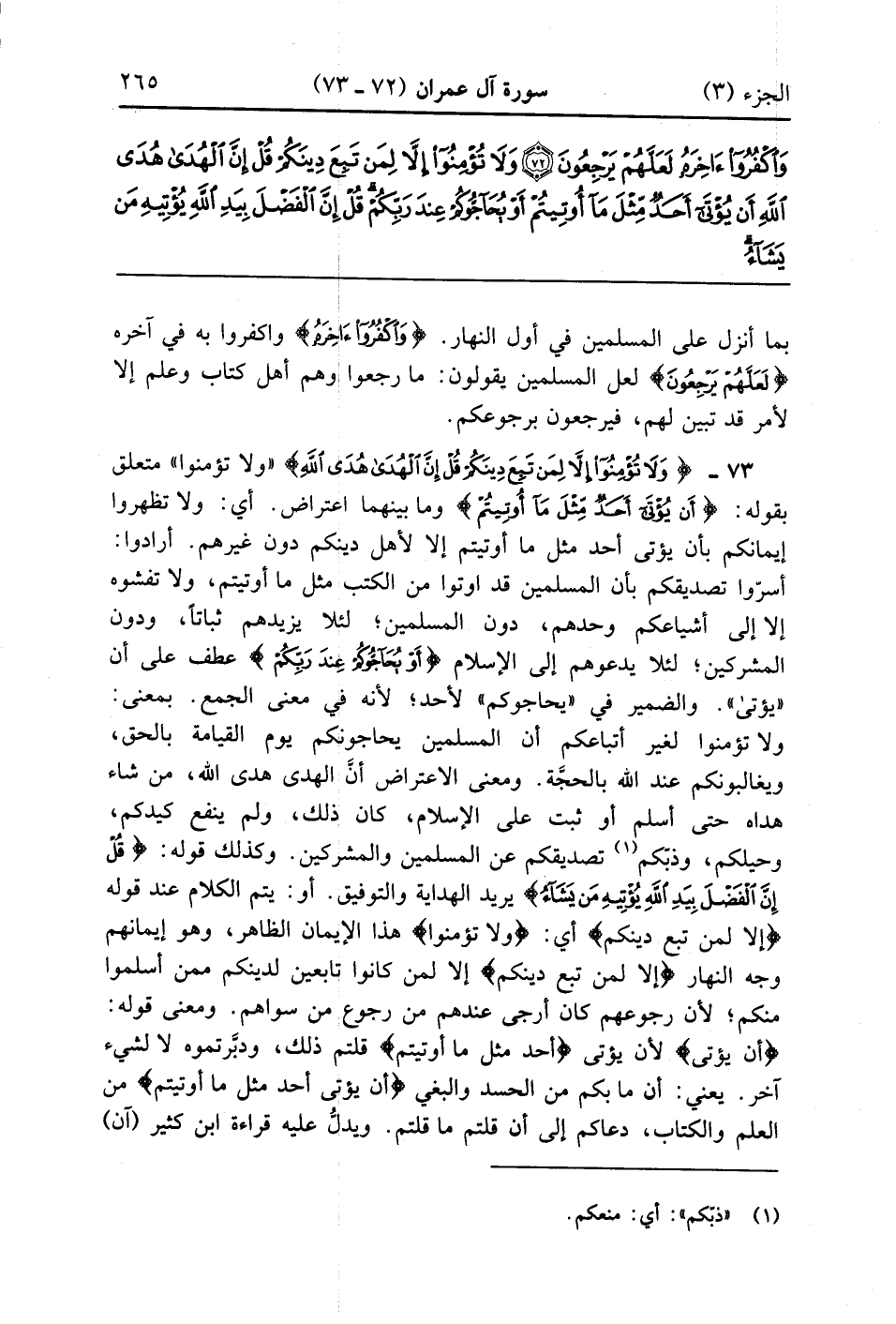 وَلَا تُؤْمِنُوا إِلَّا لِمَنْ تَبِعَ دِينَكُمْ قُلْ إِنَّ الْهُدَى هُدَى اللَّهِ أَنْ يُؤْتَى أَحَدٌ مِثْلَ مَا أُوتِيتُمْ أَوْ يُحَاجُّوكُمْ عِنْدَ رَبِّكُمْ قُلْ إِنَّ الْفَضْلَ بِيَدِ اللَّهِ يُؤْتِيهِ مَنْ يَشَاءُ وَاللَّهُ وَاسِعٌ عَلِيمٌ (73)