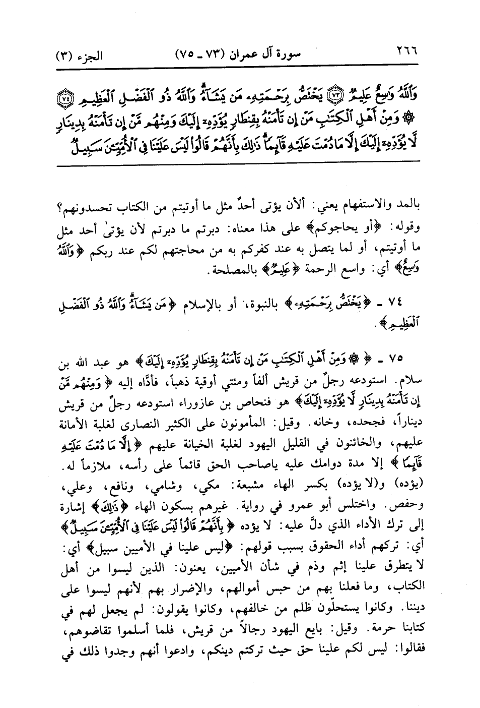 وَمِنْ أَهْلِ الْكِتَابِ مَنْ إِنْ تَأْمَنْهُ بِقِنْطَارٍ يُؤَدِّهِ إِلَيْكَ وَمِنْهُمْ مَنْ إِنْ تَأْمَنْهُ بِدِينَارٍ لَا يُؤَدِّهِ إِلَيْكَ إِلَّا مَا دُمْتَ عَلَيْهِ قَائِمًا ذَلِكَ بِأَنَّهُمْ قَالُوا لَيْسَ عَلَيْنَا فِي الْأُمِّيِّينَ سَبِيلٌ وَيَقُولُونَ عَلَى اللَّهِ الْكَذِبَ وَهُمْ يَعْلَمُونَ (75)