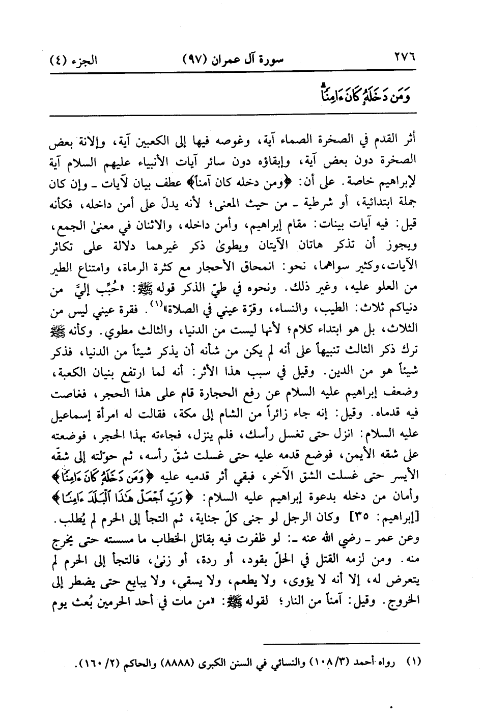 من حيث المعنى لأنه يدل على أمن داخله فكأنه قيل فيه آيات بينات مقام لإبراهيم وأمن داخله والاثنان في معنى الجمع ويجوز أن يذكر هاتان الآيتان ويطوى ذكر غيرهما لدلالة على تكاثر الآيات كأنه قيل فيه آيات بينات مقام إبراهيم وأمن داخله وكثير سواهما نحوا نمحاق الأحجار مع كثرة الرماة وامتناع الطير من العلو عليه وغير ذلك ونحوه في طي الذكر قوله عليه السلام حبب إليّ من دنياكم ثلاث الطيب والنساء وقرة عيني في الصلاة فقرة عيني ليس من الثلاث بل هو ابتداء كلام لأنها ليست من الدنيا والثالث يطوى وكأنه عليه السلام ترك ذكر الثالث تنبيهاً على أنه لم يكن من شأنه أن يذكر شيئاً من الدنيا فذكر شيئاً هو من الدين وقيل في سبب هذا الأثر أنه لما ارتفع بنيان الكعبة وضعف إبراهيم عليه السلام عن رفع الحجارة قام على هذا الحجر فغاصت فيه قدماه وقيل إنه جاء زائراً من الشام إلى مكة فقالت له امرأة اسمعيل عليه السلام إِنزل حتى تغسل رأسك فلم ينزل فجاءته بهذا الحجر فوضعته على شقه الأيمن فوضع قدمه عليه حتى غسلت شق رأسه ثم حولته إلى شقه الأيسر حتى غسلت الشق الآخر فبقي أثر قدميه عليه وأمان من دخله بدعوة إبراهيم عليه السلام رب اجعل هذا البلد آمنا وكان الرجل لوجنى كل جناية ثم التجأ إلى الحرم لم يطلب وعن عمر رضى الله عنه لو ظفرت فيه بقاتل الخطاب مامسته حتى يخرج منه ومن لزمه الفتل فى الحل بقود اوردة أو زنا فالتجأ إلى الحرم لم يتعرض له إلا أنه لا يؤوى ولا يطعم ولا يسقى ولا يبايع حتى يضطر إلى الخروج وقيل آمنا من النار لقوله عليه السلام من مات في أحد الحرمين بعث يوم