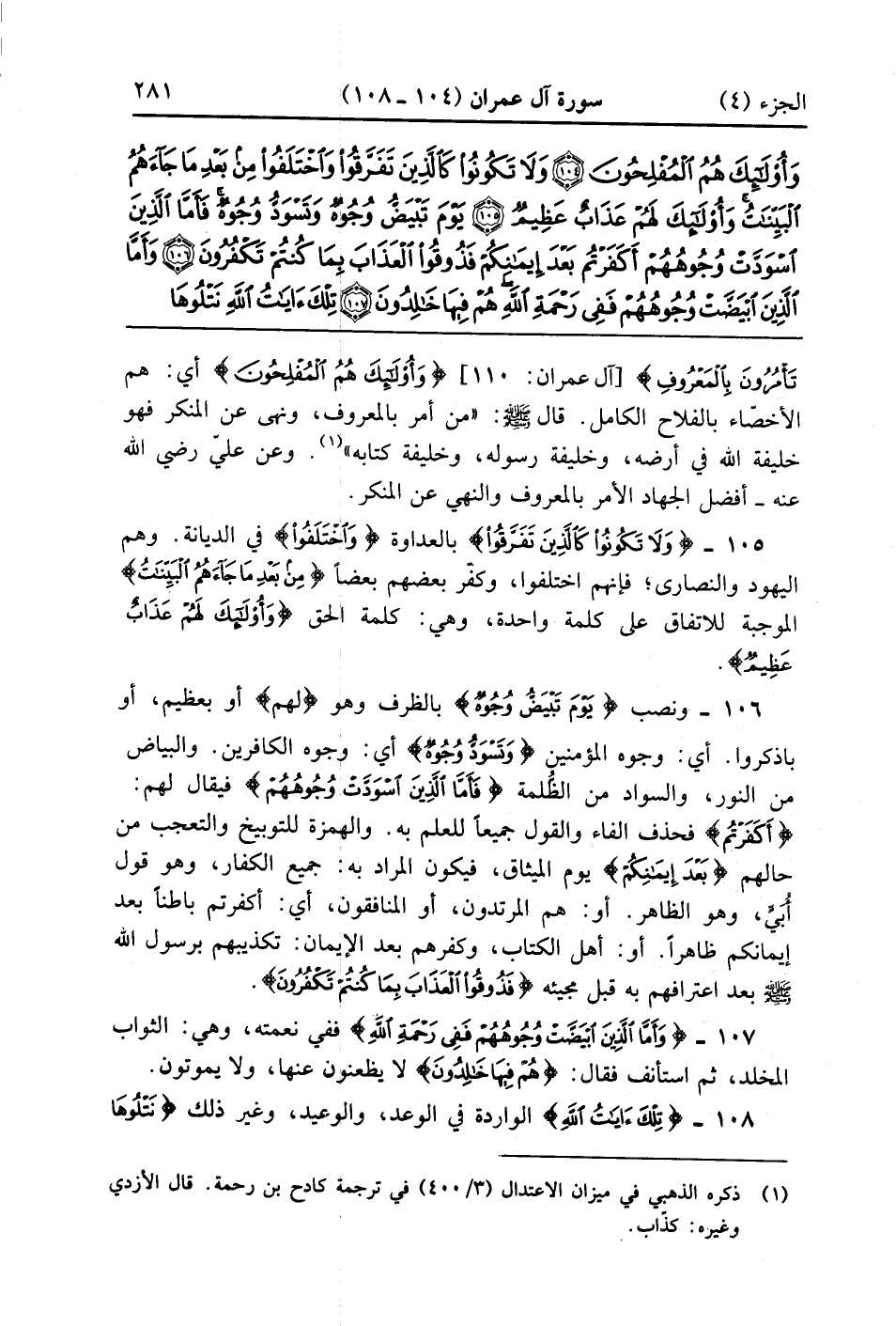 وَلَا تَكُونُوا كَالَّذِينَ تَفَرَّقُوا وَاخْتَلَفُوا مِنْ بَعْدِ مَا جَاءَهُمُ الْبَيِّنَاتُ وَأُولَئِكَ لَهُمْ عَذَابٌ عَظِيمٌ (105)