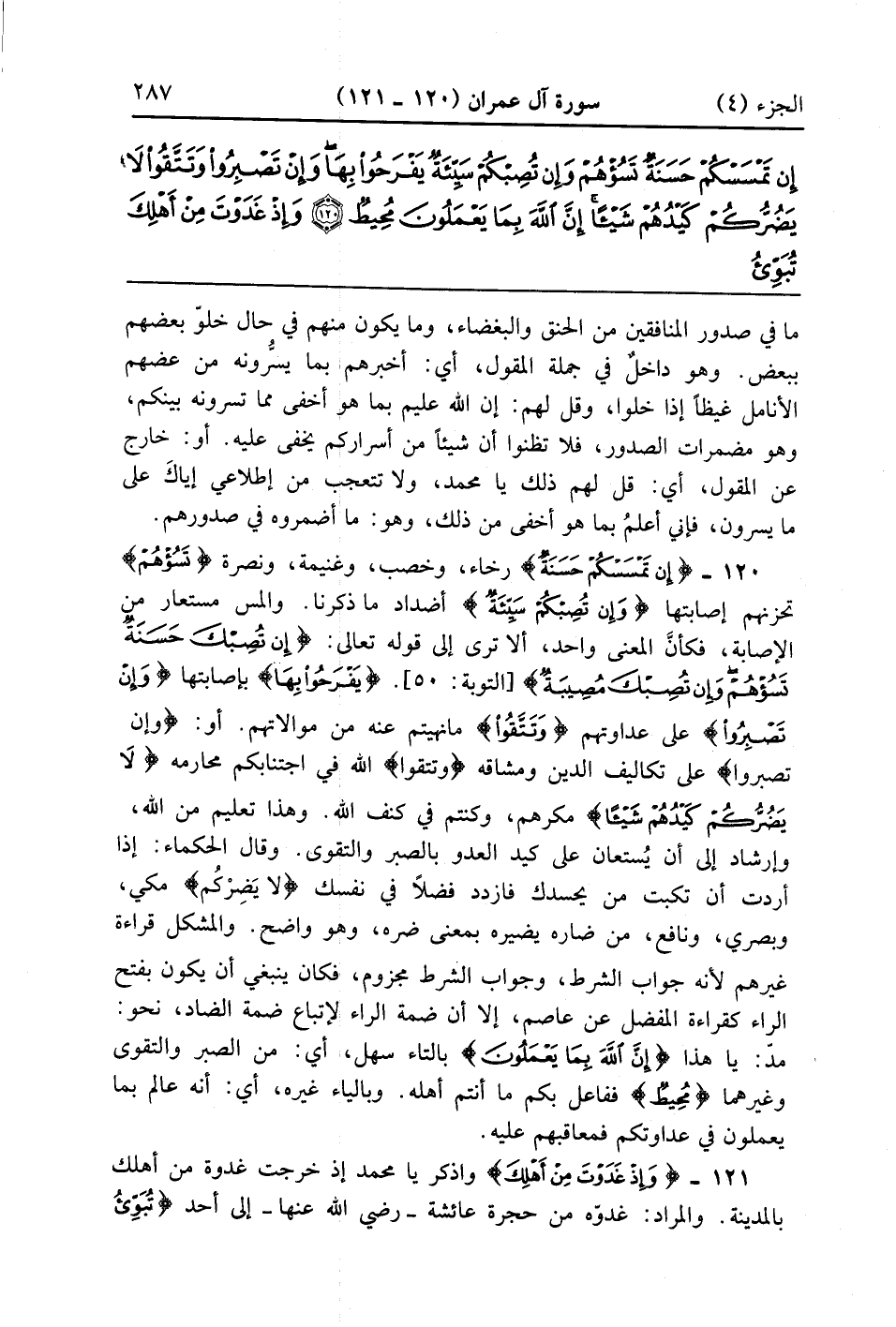 إِنْ تَمْسَسْكُمْ حَسَنَةٌ تَسُؤْهُمْ وَإِنْ تُصِبْكُمْ سَيِّئَةٌ يَفْرَحُوا بِهَا وَإِنْ تَصْبِرُوا وَتَتَّقُوا لَا يَضُرُّكُمْ كَيْدُهُمْ شَيْئًا إِنَّ اللَّهَ بِمَا يَعْمَلُونَ مُحِيطٌ (120)