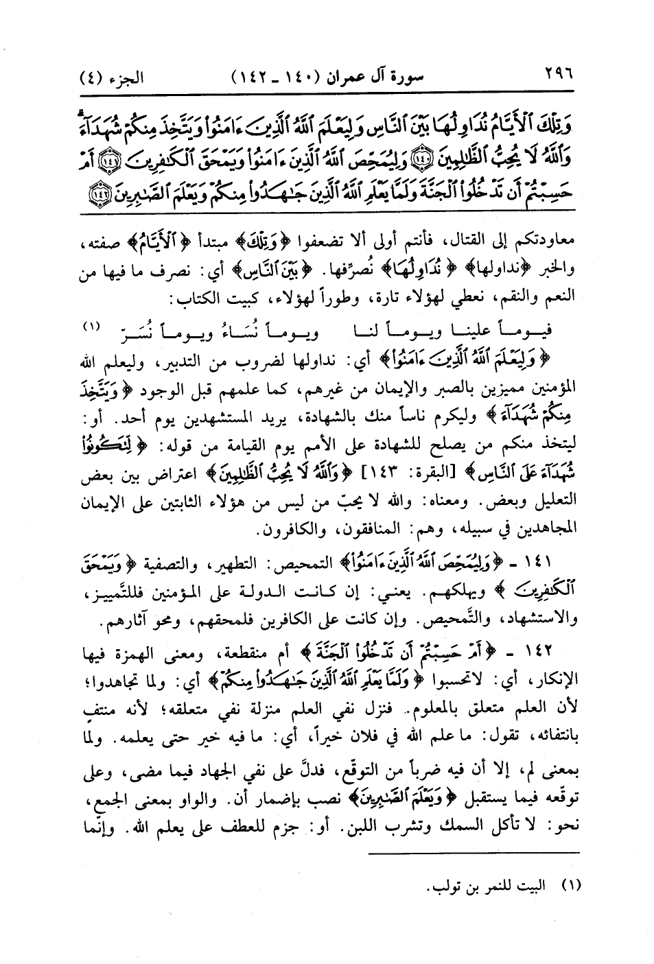 عن معاودتكم إلى القتال فأنتم أولى أن لا تضعفوا {وَتِلْكَ} مبتدأ {الأيام} صفته والخبر {نُدَاوِلُهَا} نصرفها {بَيْنَ الناس} أي نصرف ما فيها من النعم والنقم نعطي لهؤلاء تارة وطوراً لهؤلاء كبيت الكتاب ... فيوماً علينا ويوماً لنا ... ويوماً نساء ويوماً نسر ...