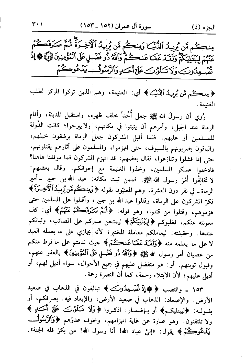 إِذْ تُصْعِدُونَ وَلَا تَلْوُونَ عَلَى أَحَدٍ وَالرَّسُولُ يَدْعُوكُمْ فِي أُخْرَاكُمْ فَأَثَابَكُمْ غَمًّا بِغَمٍّ لِكَيْلَا تَحْزَنُوا عَلَى مَا فَاتَكُمْ وَلَا مَا أَصَابَكُمْ وَاللَّهُ خَبِيرٌ بِمَا تَعْمَلُونَ (153)