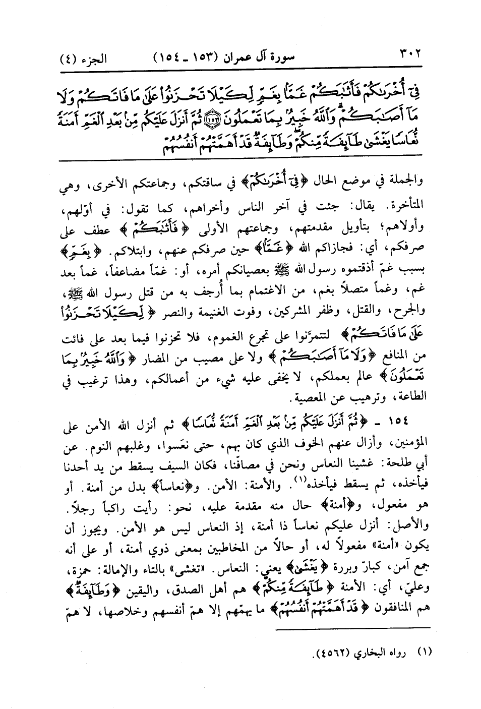 ثُمَّ أَنْزَلَ عَلَيْكُمْ مِنْ بَعْدِ الْغَمِّ أَمَنَةً نُعَاسًا يَغْشَى طَائِفَةً مِنْكُمْ وَطَائِفَةٌ قَدْ أَهَمَّتْهُمْ أَنْفُسُهُمْ يَظُنُّونَ بِاللَّهِ غَيْرَ الْحَقِّ ظَنَّ الْجَاهِلِيَّةِ يَقُولُونَ هَلْ لَنَا مِنَ الْأَمْرِ مِنْ شَيْءٍ قُلْ إِنَّ الْأَمْرَ كُلَّهُ لِلَّهِ يُخْفُونَ فِي أَنْفُسِهِمْ مَا لَا يُبْدُونَ لَكَ يَقُولُونَ لَوْ كَانَ لَنَا مِنَ الْأَمْرِ شَيْءٌ مَا قُتِلْنَا هَاهُنَا قُلْ لَوْ كُنْتُمْ فِي بُيُوتِكُمْ لَبَرَزَ الَّذِينَ كُتِبَ عَلَيْهِمُ الْقَتْلُ إِلَى مَضَاجِعِهِمْ وَلِيَبْتَلِيَ اللَّهُ مَا فِي صُدُورِكُمْ وَلِيُمَحِّصَ مَا فِي قُلُوبِكُمْ وَاللَّهُ عَلِيمٌ بِذَاتِ الصُّدُورِ (154)