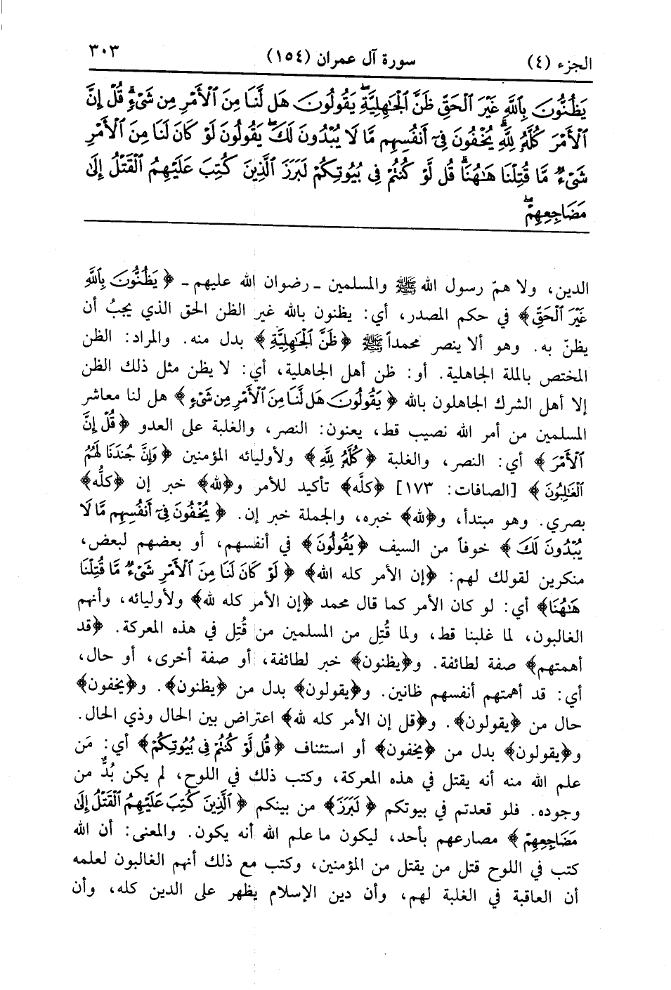 الدين ولاهم رسول صلى الله عليه وسلم والمسلمين رضوان الله عليهم {يَظُنُّونَ بالله غَيْرَ الحق} في حكم المصدر أي يظنون بالله غير الظن الحق الذى يحب أن يظن به وهو أن لا ينصر محمدا صلى الله عليه وسلم {ظَنَّ الجاهلية} بدل منه والمراد الظن المختص بالمللة الجاهلية أو ظن أهل الجاهلية أي لا يظن مثل ذلك الظن إلا أهل الشرك الجاهلون بالله {يَقُولُونَ هَل لَّنَا مِنَ الأمر مِن شَىْء} هل لنا معاشر المسلمين من أمر الله نصيب قط يعنون النصر والغلبة على العدو {قُلْ إِنَّ الأمر} أي النصر والغلبة {كُلُّهُ لِلهِ} ولأوليائه المؤمنين وَإِنَّ جُندَنَا لهم الغالبون كله تأكيد للأمر ولله خبران كله بصرى وهو مبتدأ ولله خبره والجملة خبران {يُخْفُونَ فِى أَنْفُسِهِم مَّا لاَ يُبْدُونَ لَكَ} خوفاً من السيف {يَقُولُونَ} في أنفسهم أو بعضهم لبعض منكرين لقولك لهم إن الأمر كله لله {لَوْ كَانَ لَنَا مِنَ الأمر شيء ما قتلنا ها هنا} أي لو كان الأمر كما قال محمد إن الأمر كله لله ولأوليائه وأنهم الغالبون لما غلبنا قط ولما قتل من المسلمين من قتل في هذه المعركة قد أهمتهم صفة لطائفة ويظنون خبر لطائفة أو صفة أخرى أو حال أي قد اهمتهم أنفسهم ظانين ويقولون بدل من يظنون ويخفون حال من يقولون وقل إن الأمر كله لله اعتراض بين الحال وذي الحال ويقولون بدل من يخفون أو استئناف {قُل لَّوْ كنتم في بيوتكم} أى ن علم الله منه أنه يقتل في هذه المعركة وكتب ذلك في اللوح لم يكن بد من وجوده فلو قعدتم في بيوتكم {لَبَرَزَ} من بينكم {الذين كُتِبَ عَلَيْهِمُ القتل إلى مَضَاجِعِهِمْ} مصارعهم بأحد ليكون ما علم الله أنه يكون والمعنى أن الله كتب في اللوح قتل من يقتل من المؤمنين وكتب مع ذلك أنهم الغالبون لعلمه أن العاقبة في الغلبة لهم وأن دين الإسلام يظهر على الدين كله وأن