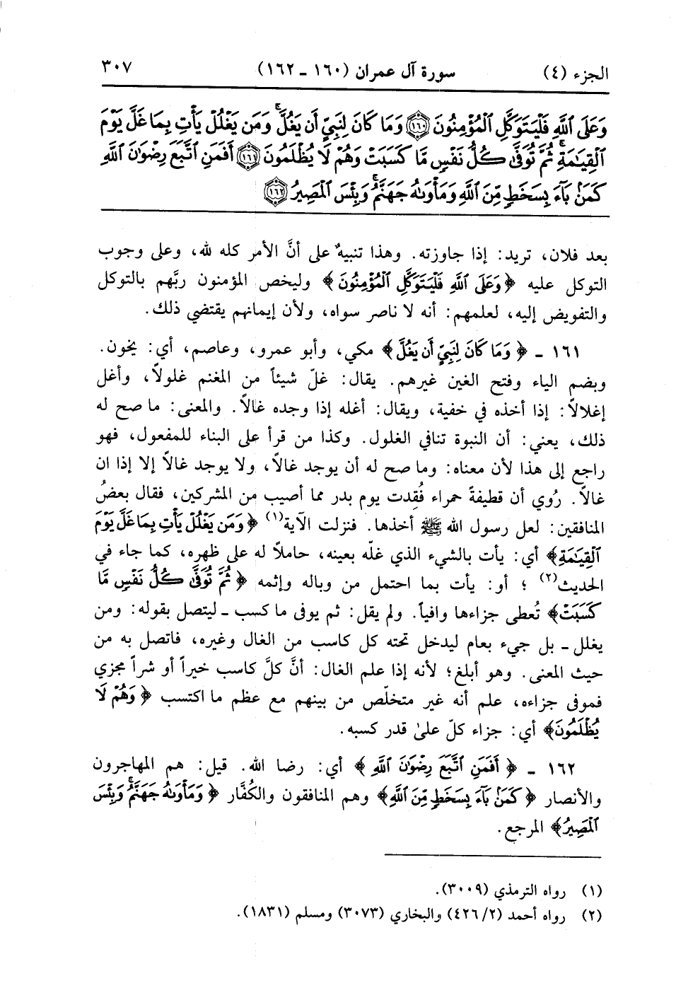 وَمَا كَانَ لِنَبِيٍّ أَنْ يَغُلَّ وَمَنْ يَغْلُلْ يَأْتِ بِمَا غَلَّ يَوْمَ الْقِيَامَةِ ثُمَّ تُوَفَّى كُلُّ نَفْسٍ مَا كَسَبَتْ وَهُمْ لَا يُظْلَمُونَ (161)