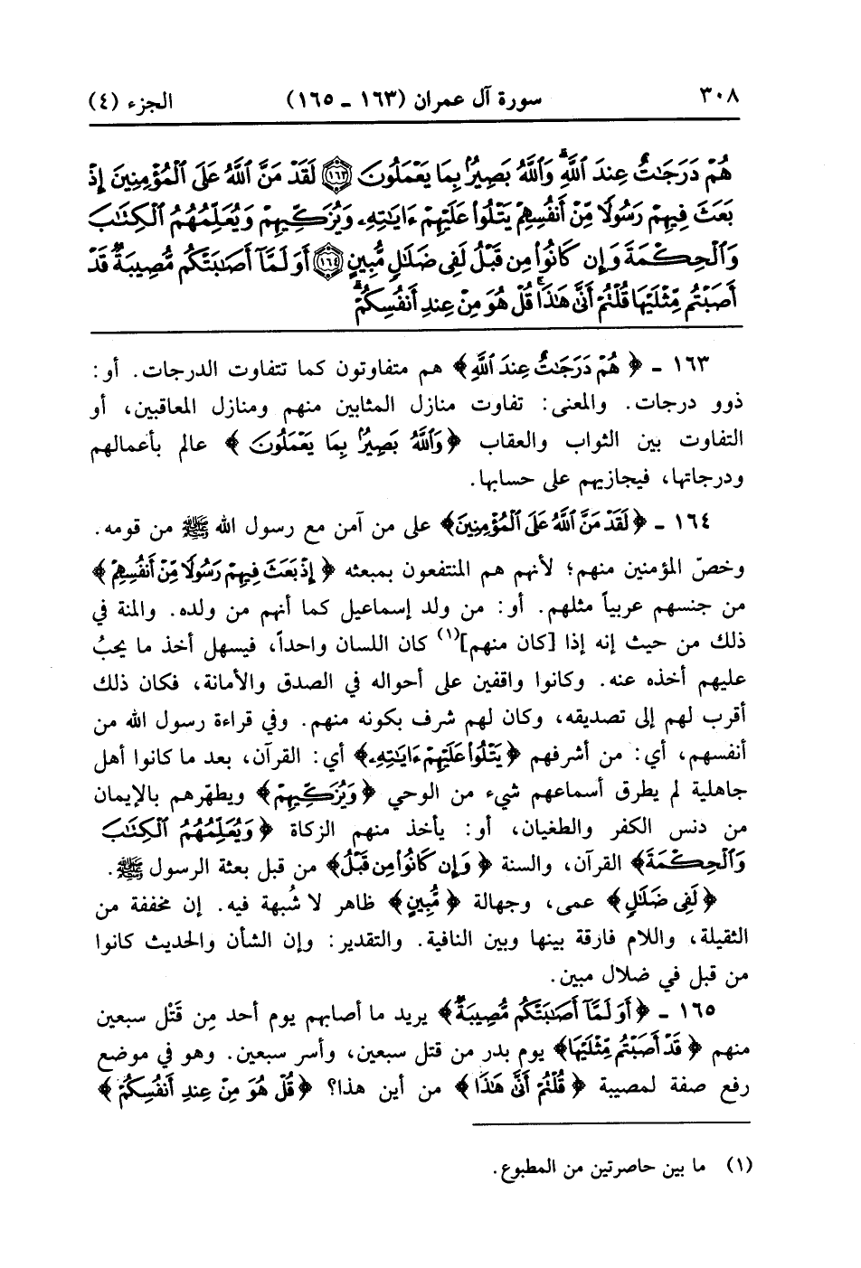 لَقَدْ مَنَّ اللَّهُ عَلَى الْمُؤْمِنِينَ إِذْ بَعَثَ فِيهِمْ رَسُولًا مِنْ أَنْفُسِهِمْ يَتْلُو عَلَيْهِمْ آيَاتِهِ وَيُزَكِّيهِمْ وَيُعَلِّمُهُمُ الْكِتَابَ وَالْحِكْمَةَ وَإِنْ كَانُوا مِنْ قَبْلُ لَفِي ضَلَالٍ مُبِينٍ (164)