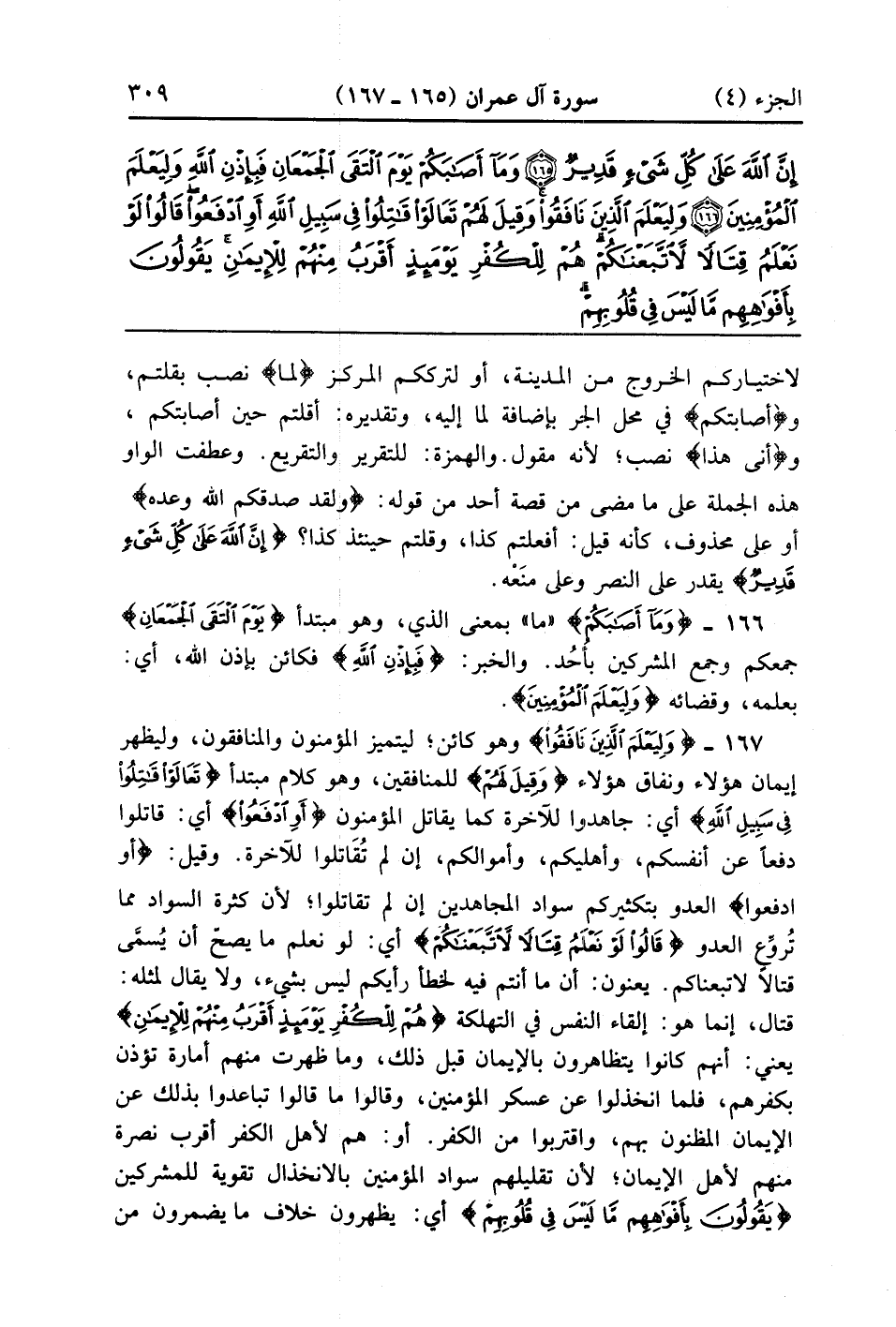 وَلِيَعْلَمَ الَّذِينَ نَافَقُوا وَقِيلَ لَهُمْ تَعَالَوْا قَاتِلُوا فِي سَبِيلِ اللَّهِ أَوِ ادْفَعُوا قَالُوا لَوْ نَعْلَمُ قِتَالًا لَاتَّبَعْنَاكُمْ هُمْ لِلْكُفْرِ يَوْمَئِذٍ أَقْرَبُ مِنْهُمْ لِلْإِيمَانِ يَقُولُونَ بِأَفْوَاهِهِمْ مَا لَيْسَ فِي قُلُوبِهِمْ وَاللَّهُ أَعْلَمُ بِمَا يَكْتُمُونَ (167)