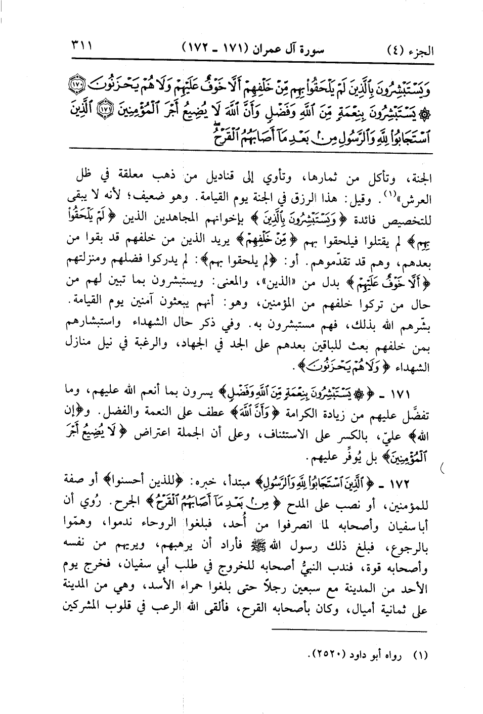الَّذِينَ اسْتَجَابُوا لِلَّهِ وَالرَّسُولِ مِنْ بَعْدِ مَا أَصَابَهُمُ الْقَرْحُ لِلَّذِينَ أَحْسَنُوا مِنْهُمْ وَاتَّقَوْا أَجْرٌ عَظِيمٌ (172)