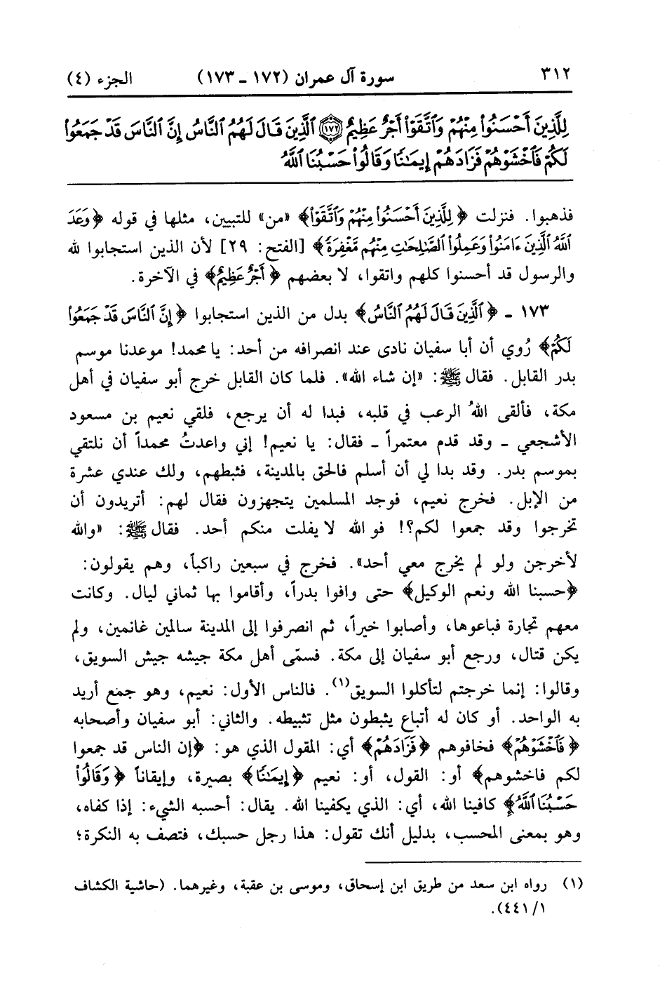 الَّذِينَ قَالَ لَهُمُ النَّاسُ إِنَّ النَّاسَ قَدْ جَمَعُوا لَكُمْ فَاخْشَوْهُمْ فَزَادَهُمْ إِيمَانًا وَقَالُوا حَسْبُنَا اللَّهُ وَنِعْمَ الْوَكِيلُ (173)