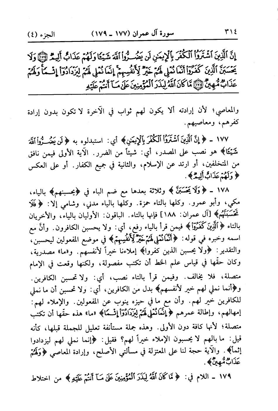 {وَلاَ يَحْسَبَنَّ} وثلاثة بعدها مع ضم الباء فى يحسبنهم بالياء مكى وأبو عمر وكلها بالتاء حمزة وكلها بالياء مدني وشامي إلا فَلاَ تَحْسَبَنَّهُمْ فإنها بالتاء الباقون الأوليان بالياء والأخريان بالتاء {الذين كَفَرُواْ} فيمن قرأ بالياء رفع أى ولا يحسبن الكافرون وإن مع اسمه وخبره في قوله {أَنَّمَا نُمْلِى لهم خير لأنفسهم} فى موضع المفعولين ليحسبن والتقدير ولا يحسبن الذين كفروا إملاءنا خيراً لأنفسهم وما مصدرية وكان حقها في قياس علم الخط أن تكتب مفصولة ولكنها وقعت في الإمام متصلة فلا يخالف وفيمن قرأ بالتاء نصب أي ولا تحسبن الكافرين وأنما نملي لهم خير لأنفسهم بدل من الكافرين أي ولا تحسبن أن ما نملي للكافرين خير لهم وان مع ما في حيزه ينوب عن المفعولين والإملاء لهم امهالهم وإطالة عمرهم {إِنَّمَا نُمْلِى لَهُمْ لِيَزْدَادُواْ إِثْمَاً} ما هذه حقها أن تكتب متصلة لأنها كافة دون الأولى وهذه جملة مستأنفة تعليل للجملة قبلها كأنه قبل ما بالهم لا يحسبون الإملاء خيراً لهم فقيل إنما نملي لهم ليزدادوا إثماً والآية حجة لنا على المعتزلة في مسألتي الأصلح وارادة المعاصى {ولهم عذاب مهين}
