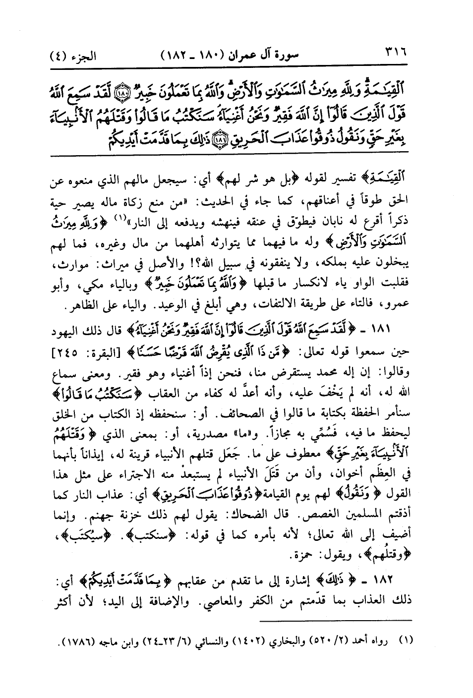 لَقَدْ سَمِعَ اللَّهُ قَوْلَ الَّذِينَ قَالُوا إِنَّ اللَّهَ فَقِيرٌ وَنَحْنُ أَغْنِيَاءُ سَنَكْتُبُ مَا قَالُوا وَقَتْلَهُمُ الْأَنْبِيَاءَ بِغَيْرِ حَقٍّ وَنَقُولُ ذُوقُوا عَذَابَ الْحَرِيقِ (181)