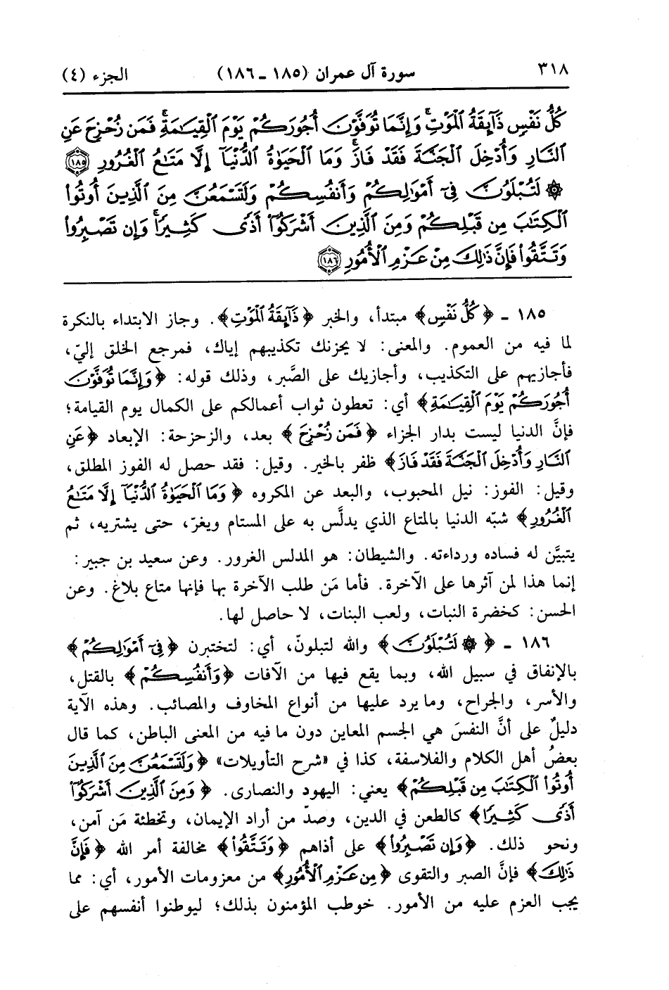 كُلُّ نَفْسٍ ذَائِقَةُ الْمَوْتِ وَإِنَّمَا تُوَفَّوْنَ أُجُورَكُمْ يَوْمَ الْقِيَامَةِ فَمَنْ زُحْزِحَ عَنِ النَّارِ وَأُدْخِلَ الْجَنَّةَ فَقَدْ فَازَ وَمَا الْحَيَاةُ الدُّنْيَا إِلَّا مَتَاعُ الْغُرُورِ (185)
