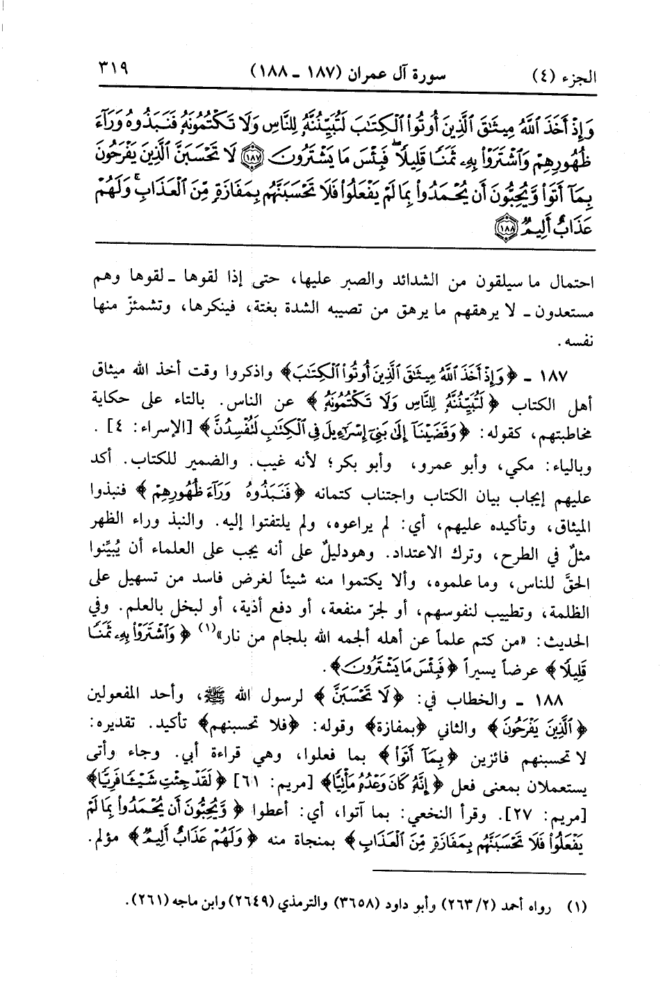 وَإِذْ أَخَذَ اللَّهُ مِيثَاقَ الَّذِينَ أُوتُوا الْكِتَابَ لَتُبَيِّنُنَّهُ لِلنَّاسِ وَلَا تَكْتُمُونَهُ فَنَبَذُوهُ وَرَاءَ ظُهُورِهِمْ وَاشْتَرَوْا بِهِ ثَمَنًا قَلِيلًا فَبِئْسَ مَا يَشْتَرُونَ (187)