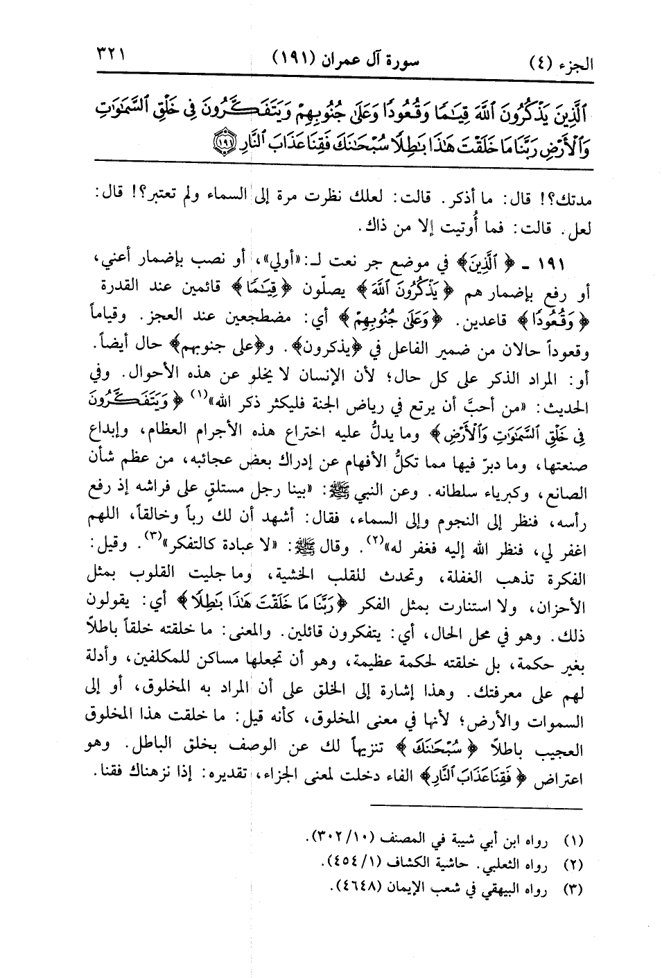 الَّذِينَ يَذْكُرُونَ اللَّهَ قِيَامًا وَقُعُودًا وَعَلَى جُنُوبِهِمْ وَيَتَفَكَّرُونَ فِي خَلْقِ السَّمَاوَاتِ وَالْأَرْضِ رَبَّنَا مَا خَلَقْتَ هَذَا بَاطِلًا سُبْحَانَكَ فَقِنَا عَذَابَ النَّارِ (191)