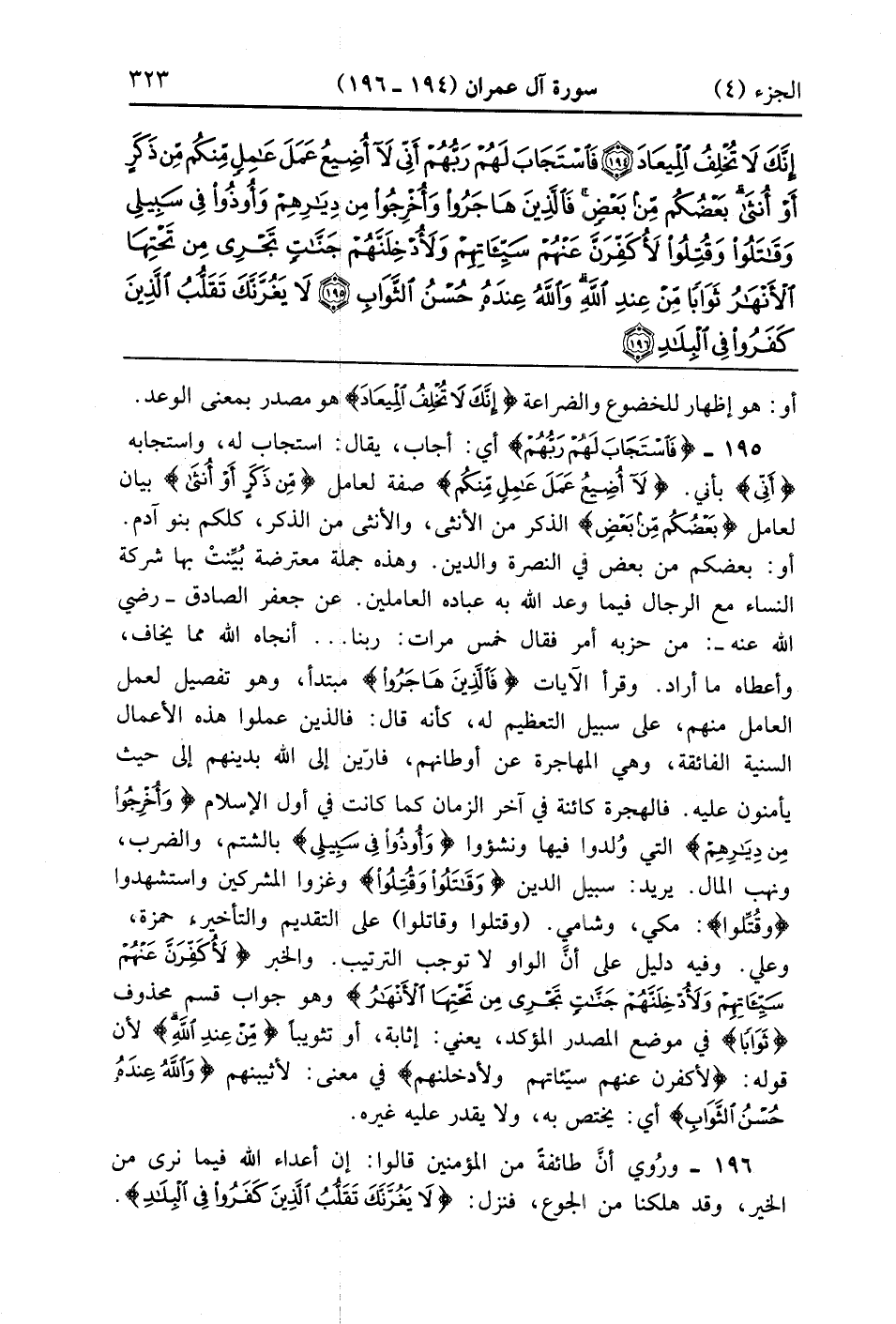 فَاسْتَجَابَ لَهُمْ رَبُّهُمْ أَنِّي لَا أُضِيعُ عَمَلَ عَامِلٍ مِنْكُمْ مِنْ ذَكَرٍ أَوْ أُنْثَى بَعْضُكُمْ مِنْ بَعْضٍ فَالَّذِينَ هَاجَرُوا وَأُخْرِجُوا مِنْ دِيَارِهِمْ وَأُوذُوا فِي سَبِيلِي وَقَاتَلُوا وَقُتِلُوا لَأُكَفِّرَنَّ عَنْهُمْ سَيِّئَاتِهِمْ وَلَأُدْخِلَنَّهُمْ جَنَّاتٍ تَجْرِي مِنْ تَحْتِهَا الْأَنْهَارُ ثَوَابًا مِنْ عِنْدِ اللَّهِ وَاللَّهُ عِنْدَهُ حُسْنُ الثَّوَابِ (195)