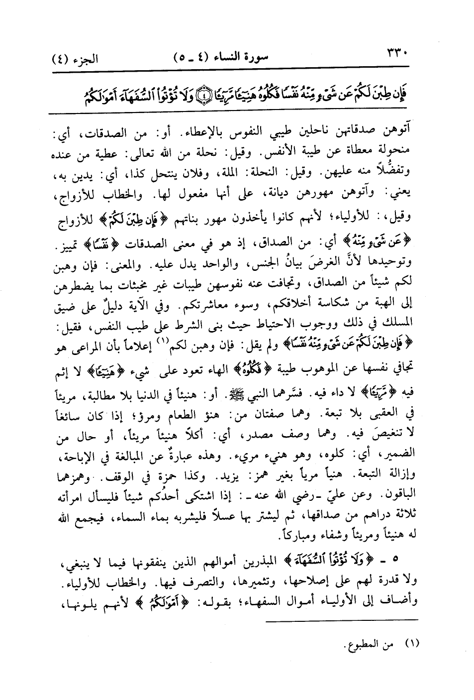 عنده وتفضلاً منه عليهن وقيل النحلة الملة وفلان ينتحل كذا أي يدين به يعني وآتوهن مهورهن ديانة على أنها مفعول لها والخطاب للأزواج وقيل للأولياء لأنهم كانوا يأخذون مهور بناتهم {فَإِن طِبْنَ لَكُمْ} للأزواج {عَن شيء منه} أى من الصداق اذهو في معنى الصدقات {نَفْساً} تمييز وتوحيدها لأن الغرض بيان الجنس والواحد يدل عليه والمعنى فإن وهبن لكم شيئاً من الصدقات وتجافت عنه نفوسهن طيبات غير مخبثات بما يضطرهن إليه الهبة من شكاسة أخلاقكم وسوء معاشرتكم وفي الآية دليل على ضيق المسلك في ذلك ووجوب الاحتياط حيث بنى الشرط على طيب النفس فقيل فإن طبن لكم عن شيء منه نفساً ولم يقل فإن وهبن لكم إعلاماً بأن المراعي هو تجافي نفسها عن الموهوب طيبة {فَكُلُوهُ} الهاء يعود على شيء {هَنِيئَاً} لا إثم فيه {مَّرِيئاً} لا داء فيه فسرهما النبي عليه السلام أو هنيئاً في الدنيا بلا مطالبة مريئا فى العقبى لا تبعة وهما صفتان من هنؤ الطعام ومرؤ إذا كان سائغاً لا تنغيص فيه وهما وصف مصدر أي أكلاً هنيئاً مريئاً أو حال من الضمير أى كلوه وهو هنى مرئ وهذه عبارة عن المبالغة في الإباحة وإزالة التبعة هنياً مرياً بغير همز يزيد وكذا حمزة في الوقف وهمزهما الباقون وعن علي رضى الله عنه إذا اشتكى أحدكم شيئاً فليسأل امرأته ثلاثة دراهم من صداقها ثم ليشتر بها عسلاً فليشر به بماء السماء فيجمع الله له هنيئاً ومريئاً وشفاء ومباركا