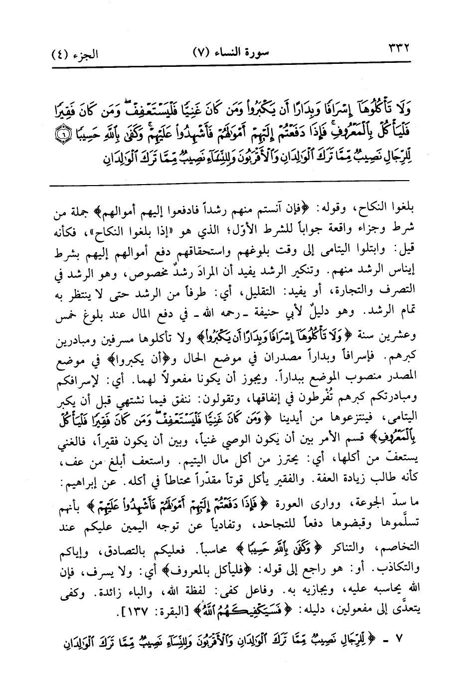لِلرِّجَالِ نَصِيبٌ مِمَّا تَرَكَ الْوَالِدَانِ وَالْأَقْرَبُونَ وَلِلنِّسَاءِ نَصِيبٌ مِمَّا تَرَكَ الْوَالِدَانِ وَالْأَقْرَبُونَ مِمَّا قَلَّ مِنْهُ أَوْ كَثُرَ نَصِيبًا مَفْرُوضًا (7)
