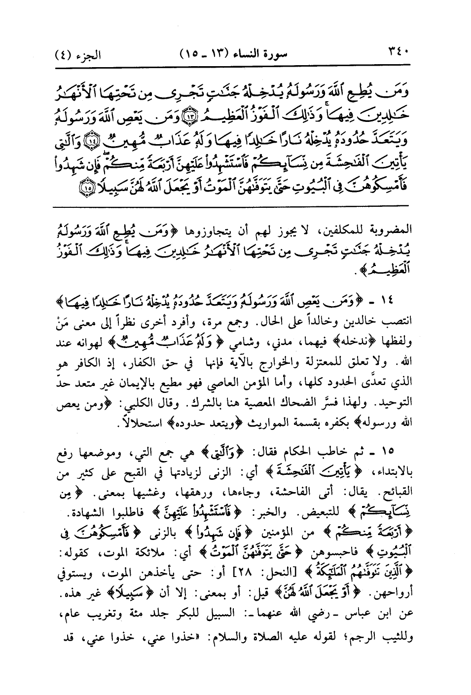 وَاللَّاتِي يَأْتِينَ الْفَاحِشَةَ مِنْ نِسَائِكُمْ فَاسْتَشْهِدُوا عَلَيْهِنَّ أَرْبَعَةً مِنْكُمْ فَإِنْ شَهِدُوا فَأَمْسِكُوهُنَّ فِي الْبُيُوتِ حَتَّى يَتَوَفَّاهُنَّ الْمَوْتُ أَوْ يَجْعَلَ اللَّهُ لَهُنَّ سَبِيلًا (15)