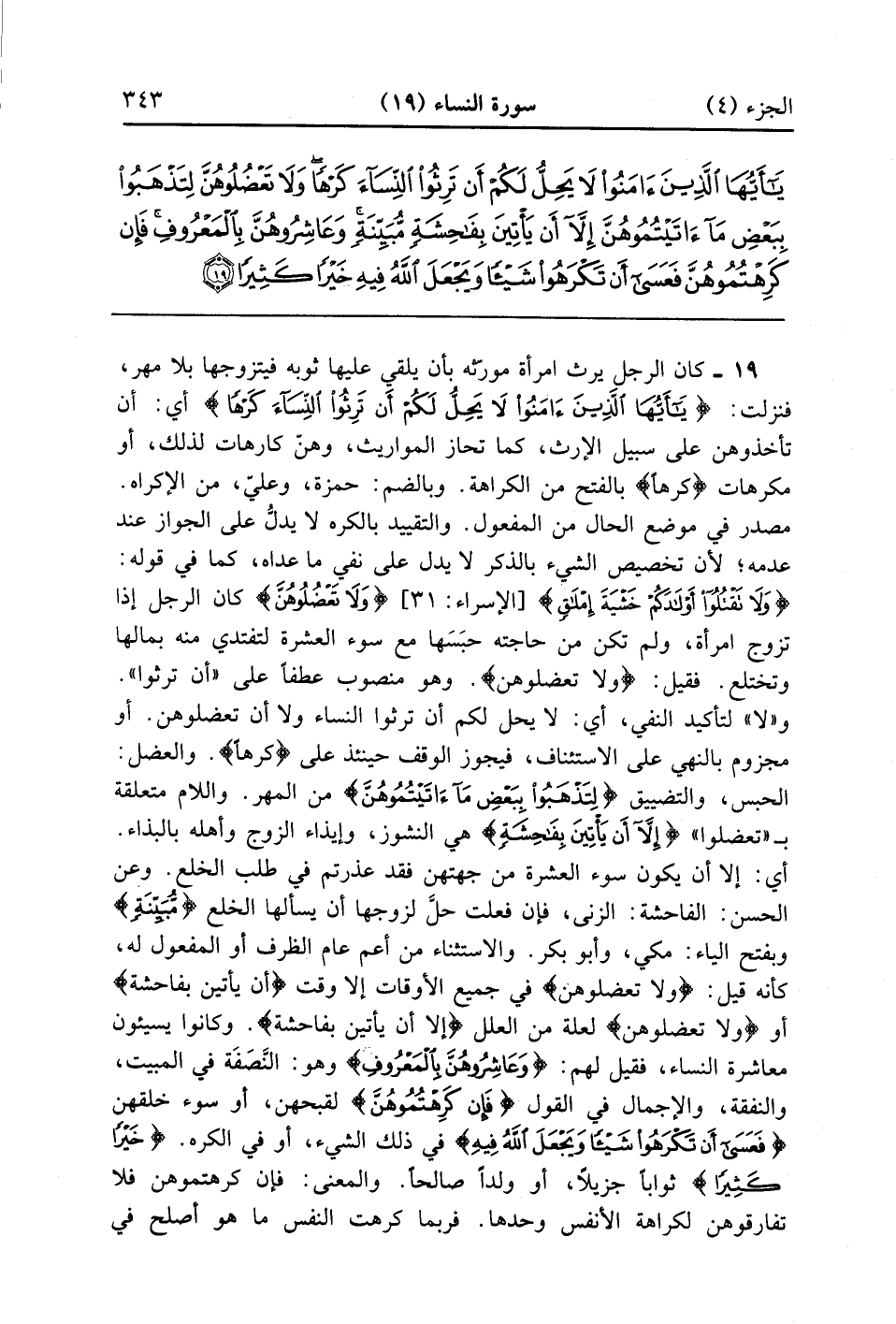 يَا أَيُّهَا الَّذِينَ آمَنُوا لَا يَحِلُّ لَكُمْ أَنْ تَرِثُوا النِّسَاءَ كَرْهًا وَلَا تَعْضُلُوهُنَّ لِتَذْهَبُوا بِبَعْضِ مَا آتَيْتُمُوهُنَّ إِلَّا أَنْ يَأْتِينَ بِفَاحِشَةٍ مُبَيِّنَةٍ وَعَاشِرُوهُنَّ بِالْمَعْرُوفِ فَإِنْ كَرِهْتُمُوهُنَّ فَعَسَى أَنْ تَكْرَهُوا شَيْئًا وَيَجْعَلَ اللَّهُ فِيهِ خَيْرًا كَثِيرًا (19)