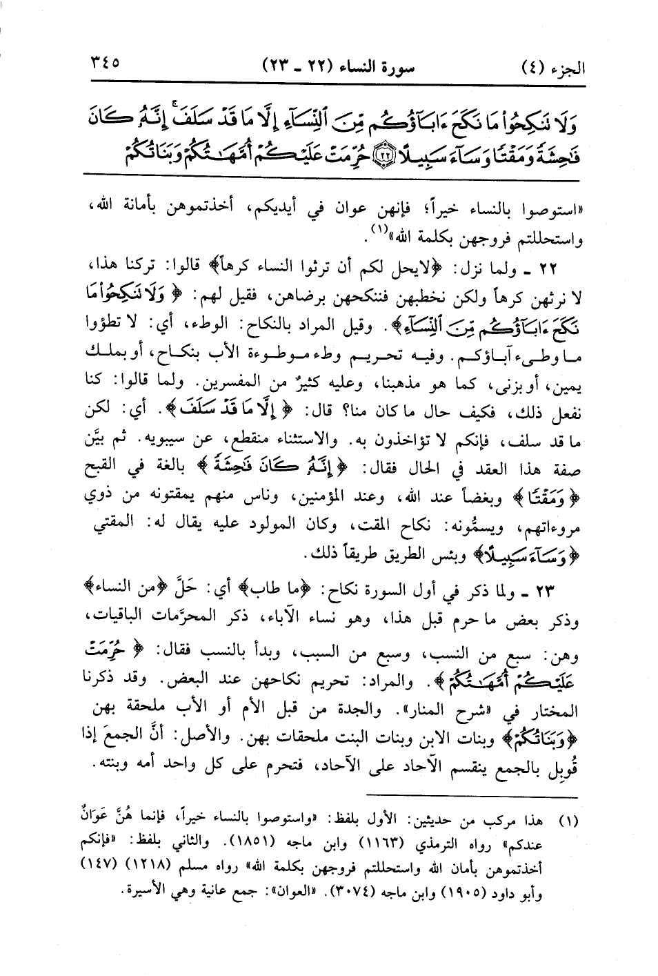 حُرِّمَتْ عَلَيْكُمْ أُمَّهَاتُكُمْ وَبَنَاتُكُمْ وَأَخَوَاتُكُمْ وَعَمَّاتُكُمْ وَخَالَاتُكُمْ وَبَنَاتُ الْأَخِ وَبَنَاتُ الْأُخْتِ وَأُمَّهَاتُكُمُ اللَّاتِي أَرْضَعْنَكُمْ وَأَخَوَاتُكُمْ مِنَ الرَّضَاعَةِ وَأُمَّهَاتُ نِسَائِكُمْ وَرَبَائِبُكُمُ اللَّاتِي فِي حُجُورِكُمْ مِنْ نِسَائِكُمُ اللَّاتِي دَخَلْتُمْ بِهِنَّ فَإِنْ لَمْ تَكُونُوا دَخَلْتُمْ بِهِنَّ فَلَا جُنَاحَ عَلَيْكُمْ وَحَلَائِلُ أَبْنَائِكُمُ الَّذِينَ مِنْ أَصْلَابِكُمْ وَأَنْ تَجْمَعُوا بَيْنَ الْأُخْتَيْنِ إِلَّا مَا قَدْ سَلَفَ إِنَّ اللَّهَ كَانَ غَفُورًا رَحِيمًا (23)