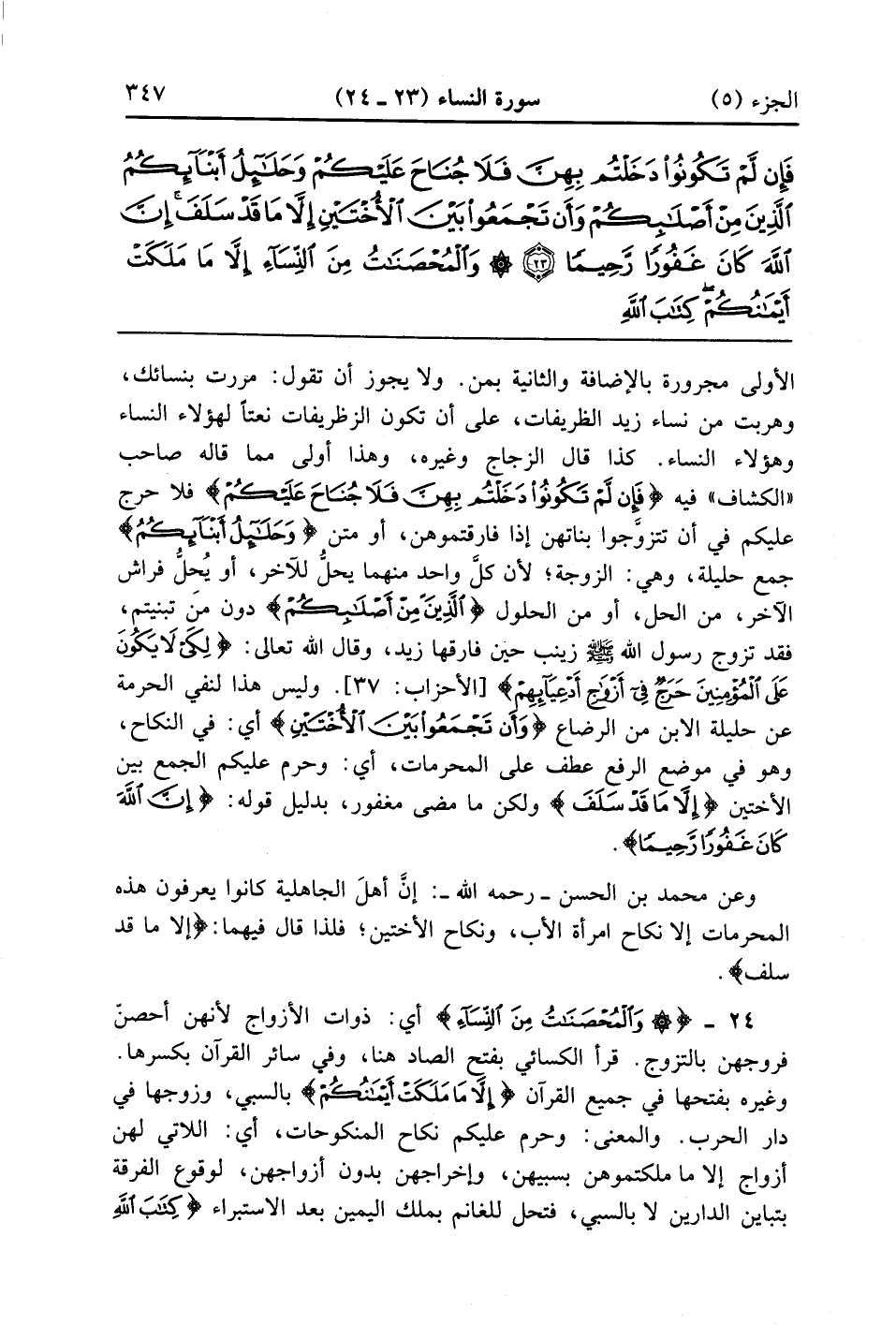 وَالْمُحْصَنَاتُ مِنَ النِّسَاءِ إِلَّا مَا مَلَكَتْ أَيْمَانُكُمْ كِتَابَ اللَّهِ عَلَيْكُمْ وَأُحِلَّ لَكُمْ مَا وَرَاءَ ذَلِكُمْ أَنْ تَبْتَغُوا بِأَمْوَالِكُمْ مُحْصِنِينَ غَيْرَ مُسَافِحِينَ فَمَا اسْتَمْتَعْتُمْ بِهِ مِنْهُنَّ فَآتُوهُنَّ أُجُورَهُنَّ فَرِيضَةً وَلَا جُنَاحَ عَلَيْكُمْ فِيمَا تَرَاضَيْتُمْ بِهِ مِنْ بَعْدِ الْفَرِيضَةِ إِنَّ اللَّهَ كَانَ عَلِيمًا حَكِيمًا (24)