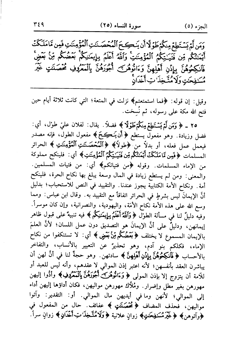 وَمَنْ لَمْ يَسْتَطِعْ مِنْكُمْ طَوْلًا أَنْ يَنْكِحَ الْمُحْصَنَاتِ الْمُؤْمِنَاتِ فَمِنْ مَا مَلَكَتْ أَيْمَانُكُمْ مِنْ فَتَيَاتِكُمُ الْمُؤْمِنَاتِ وَاللَّهُ أَعْلَمُ بِإِيمَانِكُمْ بَعْضُكُمْ مِنْ بَعْضٍ فَانْكِحُوهُنَّ بِإِذْنِ أَهْلِهِنَّ وَآتُوهُنَّ أُجُورَهُنَّ بِالْمَعْرُوفِ مُحْصَنَاتٍ غَيْرَ مُسَافِحَاتٍ وَلَا مُتَّخِذَاتِ أَخْدَانٍ فَإِذَا أُحْصِنَّ فَإِنْ أَتَيْنَ بِفَاحِشَةٍ فَعَلَيْهِنَّ نِصْفُ مَا عَلَى الْمُحْصَنَاتِ مِنَ الْعَذَابِ ذَلِكَ لِمَنْ خَشِيَ الْعَنَتَ مِنْكُمْ وَأَنْ تَصْبِرُوا خَيْرٌ لَكُمْ وَاللَّهُ غَفُورٌ رَحِيمٌ (25)