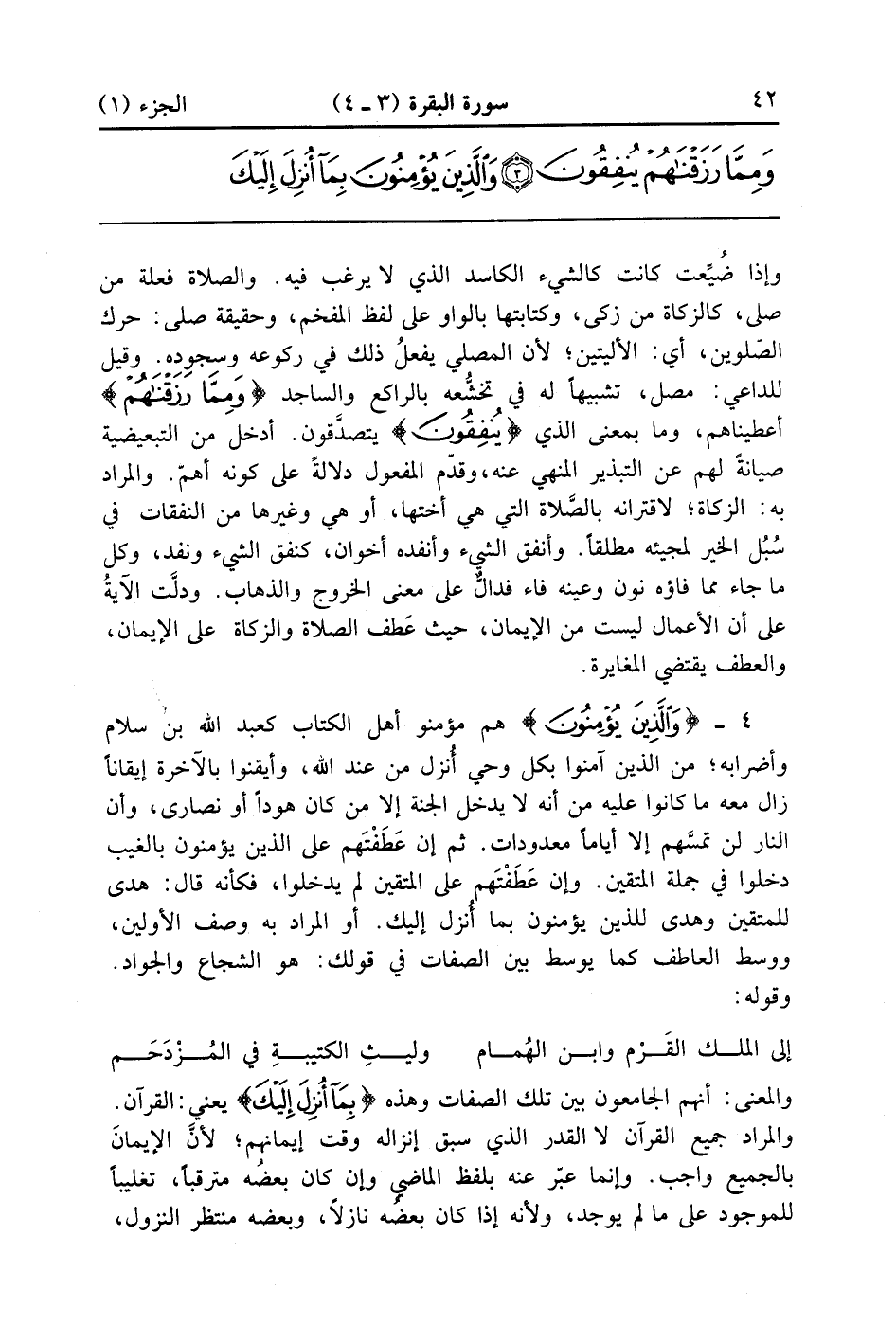 وإذا أضيعت كانت كالشئ الكاسد الذي لا يرغب فيه والصلاة فعلة من صلى كالزكاة من زكى وكتابتها بالواو على لفظ المفخم وحقيقة صلى حرك الصلوين أي الأليتين لأن المصلي يفعل ذلك في ركوعه وسجوده وقيل للداعي مصل تشبيهاً له في تخشعه بالراكع والساجد {وَمِمَّا َرَزَقْنَاهُمْ} أعطيناهم وما بمعنى الذي {يُنفِقُونَ} يتصدقون أدخل من التبعيضية صيانة لهم عن التبذير المنهي عنه وقدم المفعول دلالة على كونه أهم والمراد به الزكاة لاقترانه بالصلاة التي هي أختها أو هى وغيرها من النفقات في سبل الخير لمجيئه مطلقاً وأنفق الشئ وأنفذه إخوان كنفق الشئ ونفد وكل ما جاء مما فاؤه نون وعينه فاء فدال على معنى الخروج والذهاب ودلت الآية على أن الأعمال ليست من الإيمان حيث عطف الصلاة والزكاة على الإيمان والعطف يقتضى المغايره