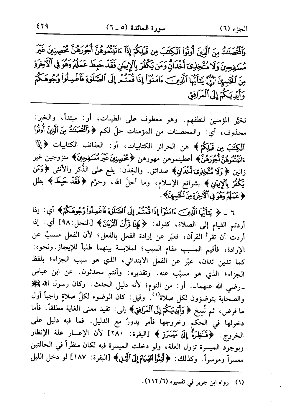 يَا أَيُّهَا الَّذِينَ آمَنُوا إِذَا قُمْتُمْ إِلَى الصَّلَاةِ فَاغْسِلُوا وُجُوهَكُمْ وَأَيْدِيَكُمْ إِلَى الْمَرَافِقِ وَامْسَحُوا بِرُءُوسِكُمْ وَأَرْجُلَكُمْ إِلَى الْكَعْبَيْنِ وَإِنْ كُنْتُمْ جُنُبًا فَاطَّهَّرُوا وَإِنْ كُنْتُمْ مَرْضَى أَوْ عَلَى سَفَرٍ أَوْ جَاءَ أَحَدٌ مِنْكُمْ مِنَ الْغَائِطِ أَوْ لَامَسْتُمُ النِّسَاءَ فَلَمْ تَجِدُوا مَاءً فَتَيَمَّمُوا صَعِيدًا طَيِّبًا فَامْسَحُوا بِوُجُوهِكُمْ وَأَيْدِيكُمْ مِنْهُ مَا يُرِيدُ اللَّهُ لِيَجْعَلَ عَلَيْكُمْ مِنْ حَرَجٍ وَلَكِنْ يُرِيدُ لِيُطَهِّرَكُمْ وَلِيُتِمَّ نِعْمَتَهُ عَلَيْكُمْ لَعَلَّكُمْ تَشْكُرُونَ (6)