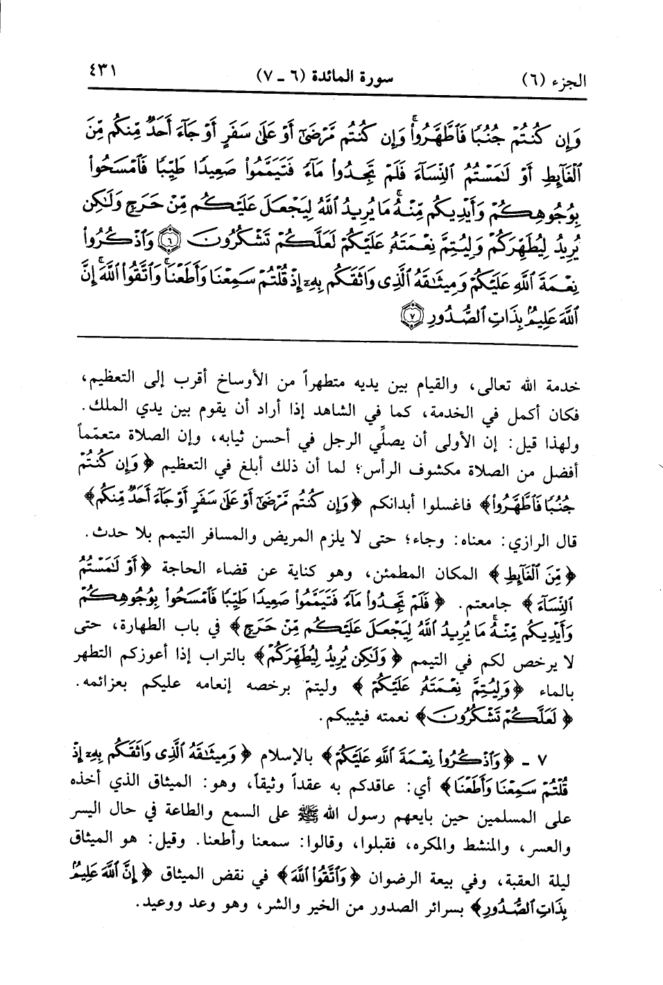 ثيابه وإن الصلاة متعمماً أفضل من الصلاة مكشوف الرأس لما أن ذلك أبلغ في التعظيم {وَإِن كُنتُمْ جُنُباً فاطهروا} فاغسلوا أبدانكم {وَإِنْ كُنتُم مرضى أَوْ على سَفَرٍ أَوْ جَاءَ أَحَدٌ مّنْكُمْ} قال الرازي معناه وجاء حتى لا يلزم المريض والمسافر التيمم بلا حدث {من الغائط} المكان المطمئن وهو كتابة عن قضاء الحاجة {أَوْ لامستم النساء} جامعتم {فَلَمْ تَجِدُواْ مَاءَ فَتَيَمَّمُواْ صَعِيداً طَيّباً فامسحوا بِوُجُوهِكُمْ وَأَيْدِيكُمْ مّنْهُ مَا يُرِيدُ الله لِيَجْعَلَ عَلَيْكُم مِّنْ حَرَجٍ} في باب الطهارة حتى لا يرخص لكم في التيمم {ولكن يُرِيدُ لِيُطَهِّرَكُمْ} بالتراب إذا أعوزكم التطهر بالماء {وَلِيُتِمَّ نِعْمَتَهُ عَلَيْكُمْ} وليتم برخصه إنعامه عليكم بعزائمه {لَعَلَّكُمْ تَشْكُرُونَ} نعمته فيثيبكم