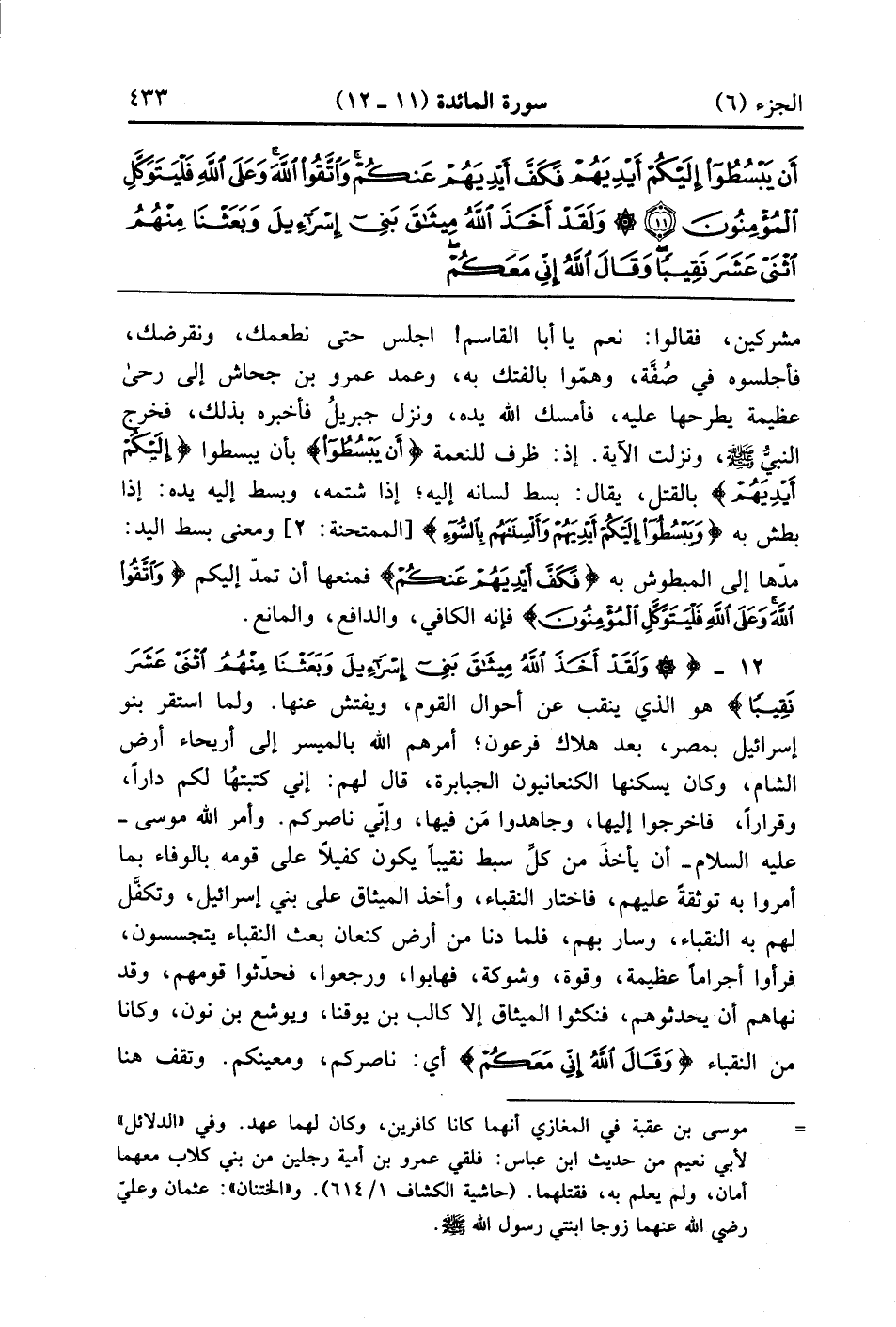{ولقد أخذ الله ميثاق بني إسرائيل وَبَعَثْنَا مِنهُمُ اثني عَشَرَ نَقِيباً} هو الذي ينقب عن أحوال القوم ويفتش عنها ولما استقر بنوا إسرائيل بمصر بعد هلاك فرعون أمرهم الله بالمسير إلى اريحاء أرض الشام وكان يسكنها الكنعانيون الجبابرة وقا لهم إني كتبتها لكم داراً وقراراً فاخرجوا إليها وجاهدوا من فيها وإني ناصركم وأمر الله موسى عليه السلام أن يأخذ من كل سبط نقيباً يكون كفيلاً على قومه بالوفاء بما أمروا به توثقة عليهم فاختار النقباء وأخذ الميثاق على بني إسرائيل وتكفل لهم النقباء وسار بهم فلما دنا من أرض كنعان بعث النقباء يتجسسوا فرأو أجراماً عظيمة وقوة وشوكة فهابوا ورجعوا فحدثوا قومهم وقد نهاهم أن يحدثوهم فنكثوا الميثاق إلا كالب بن يوقنا ويوشع بن نون وكانا من النقباء {وَقَالَ الله إِنّى مَعَكُمْ} أى ناصركم ومعينكم وتقف هنا