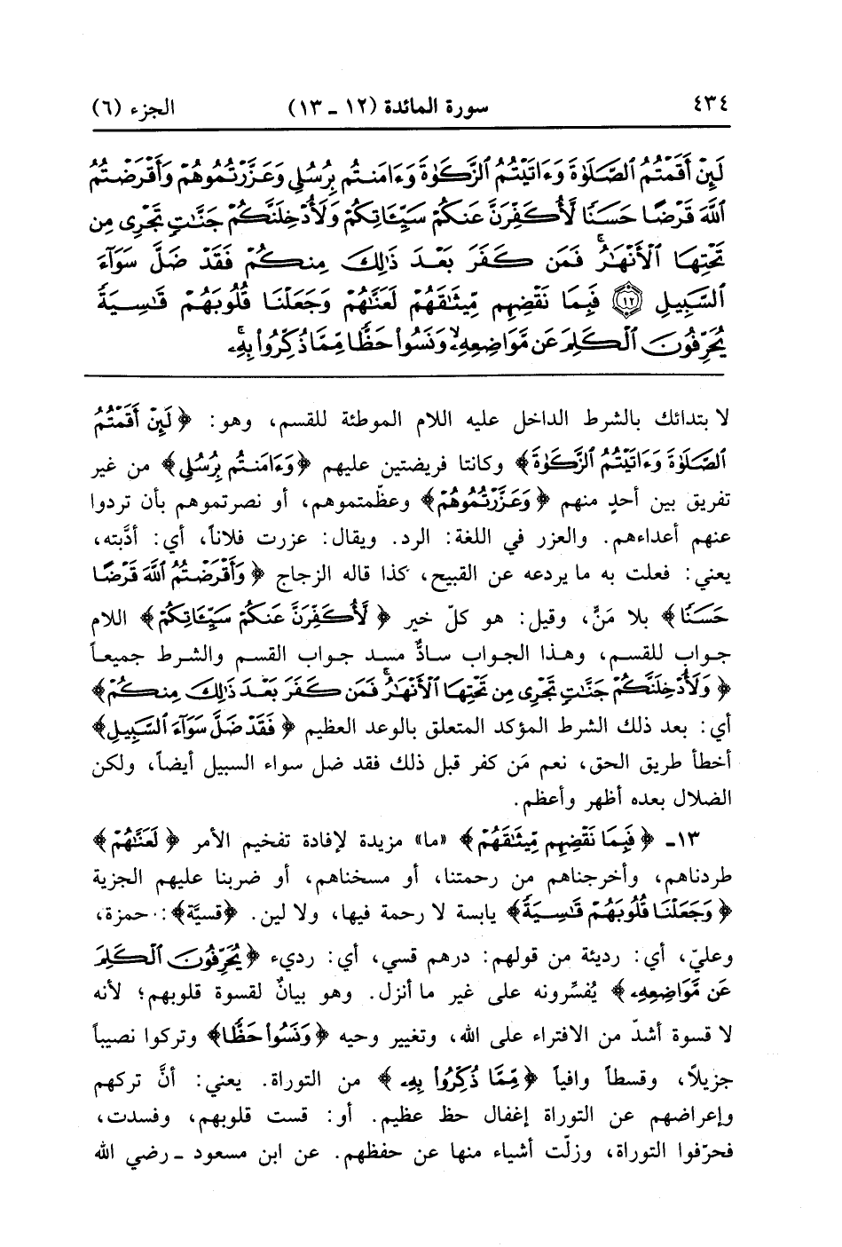 فَبِمَا نَقْضِهِمْ مِيثَاقَهُمْ لَعَنَّاهُمْ وَجَعَلْنَا قُلُوبَهُمْ قَاسِيَةً يُحَرِّفُونَ الْكَلِمَ عَنْ مَوَاضِعِهِ وَنَسُوا حَظًّا مِمَّا ذُكِّرُوا بِهِ وَلَا تَزَالُ تَطَّلِعُ عَلَى خَائِنَةٍ مِنْهُمْ إِلَّا قَلِيلًا مِنْهُمْ فَاعْفُ عَنْهُمْ وَاصْفَحْ إِنَّ اللَّهَ يُحِبُّ الْمُحْسِنِينَ (13)