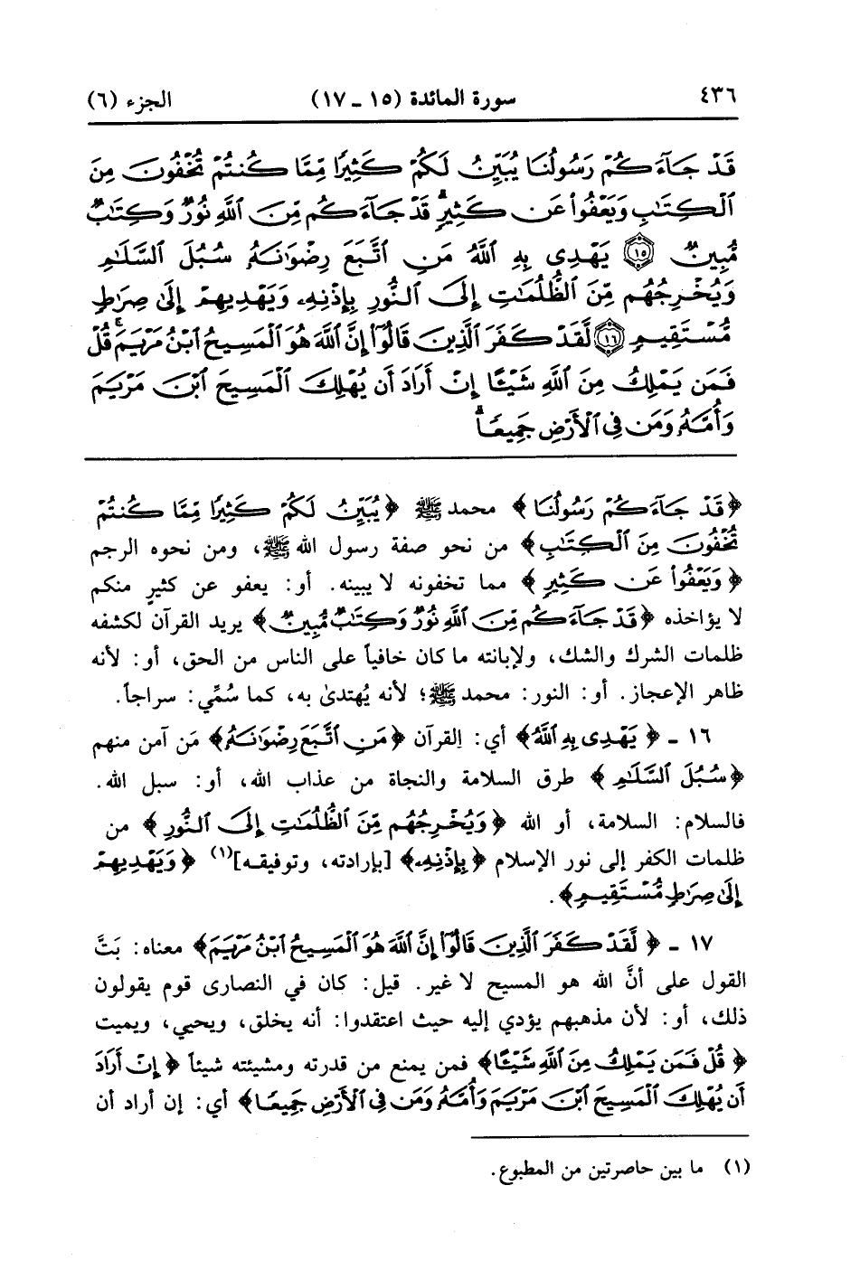 يَهْدِي بِهِ اللَّهُ مَنِ اتَّبَعَ رِضْوَانَهُ سُبُلَ السَّلَامِ وَيُخْرِجُهُمْ مِنَ الظُّلُمَاتِ إِلَى النُّورِ بِإِذْنِهِ وَيَهْدِيهِمْ إِلَى صِرَاطٍ مُسْتَقِيمٍ (16)