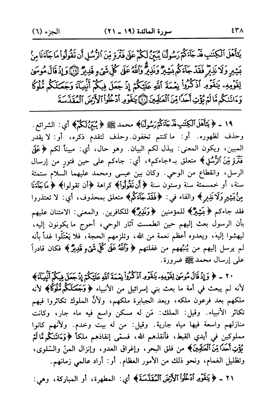 يَا أَهْلَ الْكِتَابِ قَدْ جَاءَكُمْ رَسُولُنَا يُبَيِّنُ لَكُمْ عَلَى فَتْرَةٍ مِنَ الرُّسُلِ أَنْ تَقُولُوا مَا جَاءَنَا مِنْ بَشِيرٍ وَلَا نَذِيرٍ فَقَدْ جَاءَكُمْ بَشِيرٌ وَنَذِيرٌ وَاللَّهُ عَلَى كُلِّ شَيْءٍ قَدِيرٌ (19)